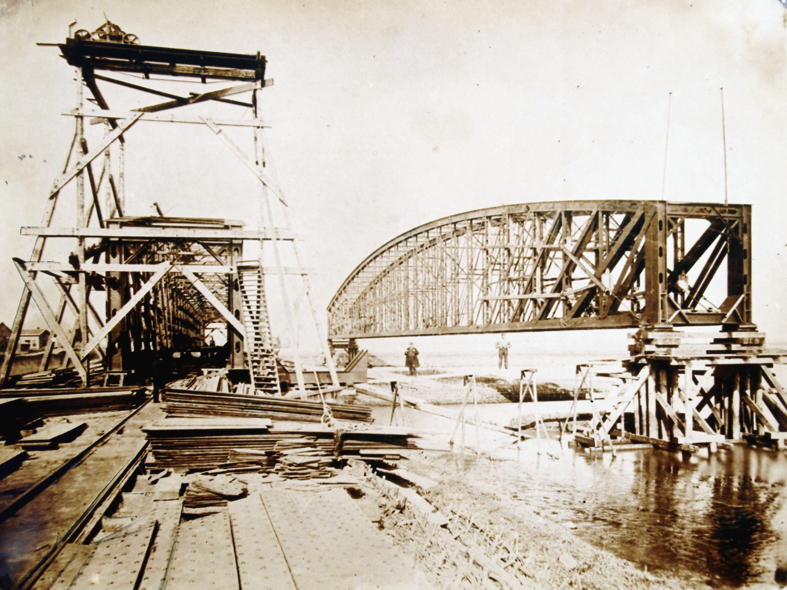 Bouw van de spoorbrug over het Hollandsch Diep naar Moerdijk.