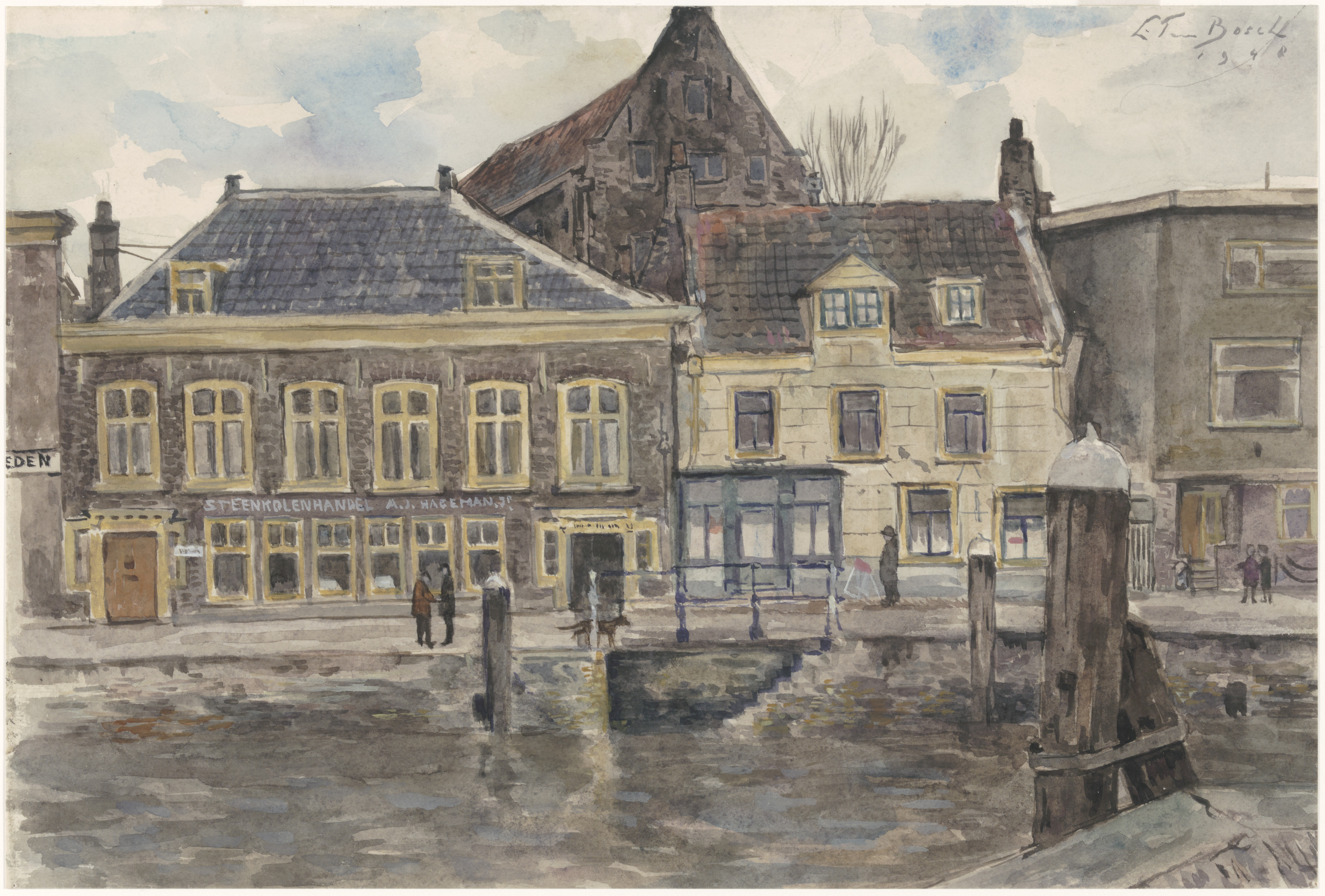 - Gezicht op een gedeelte van de bebouwing van de Kuipershaven ten zuiden van de Damiatebrug van de Wolwevershaven.