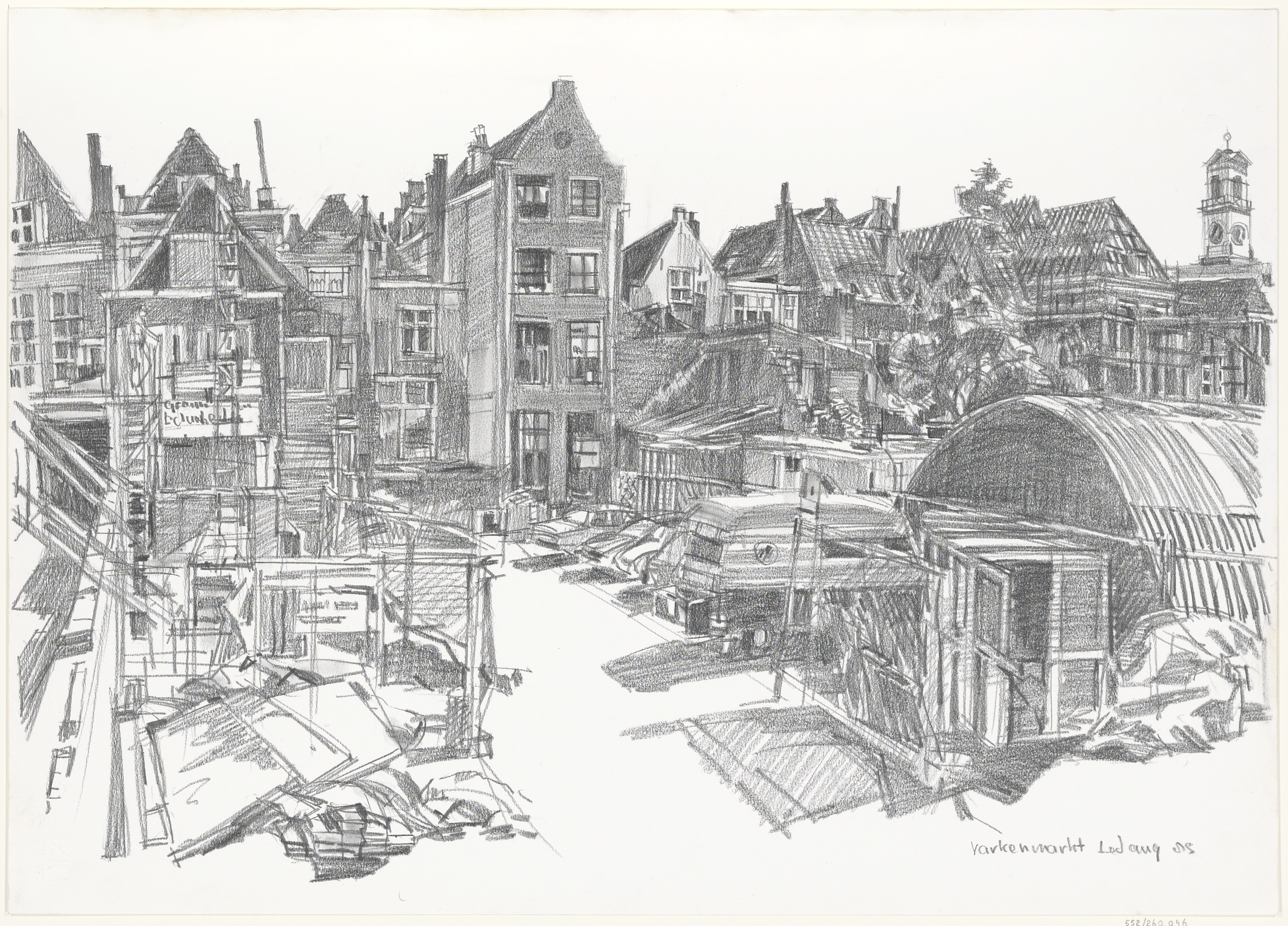 - Het zicht vanaf de Varkenmarkt op het latere Buddingh' plein met de achterzijde van de huizen aan de Groenmarkt ter hoogte van De Sleutel.