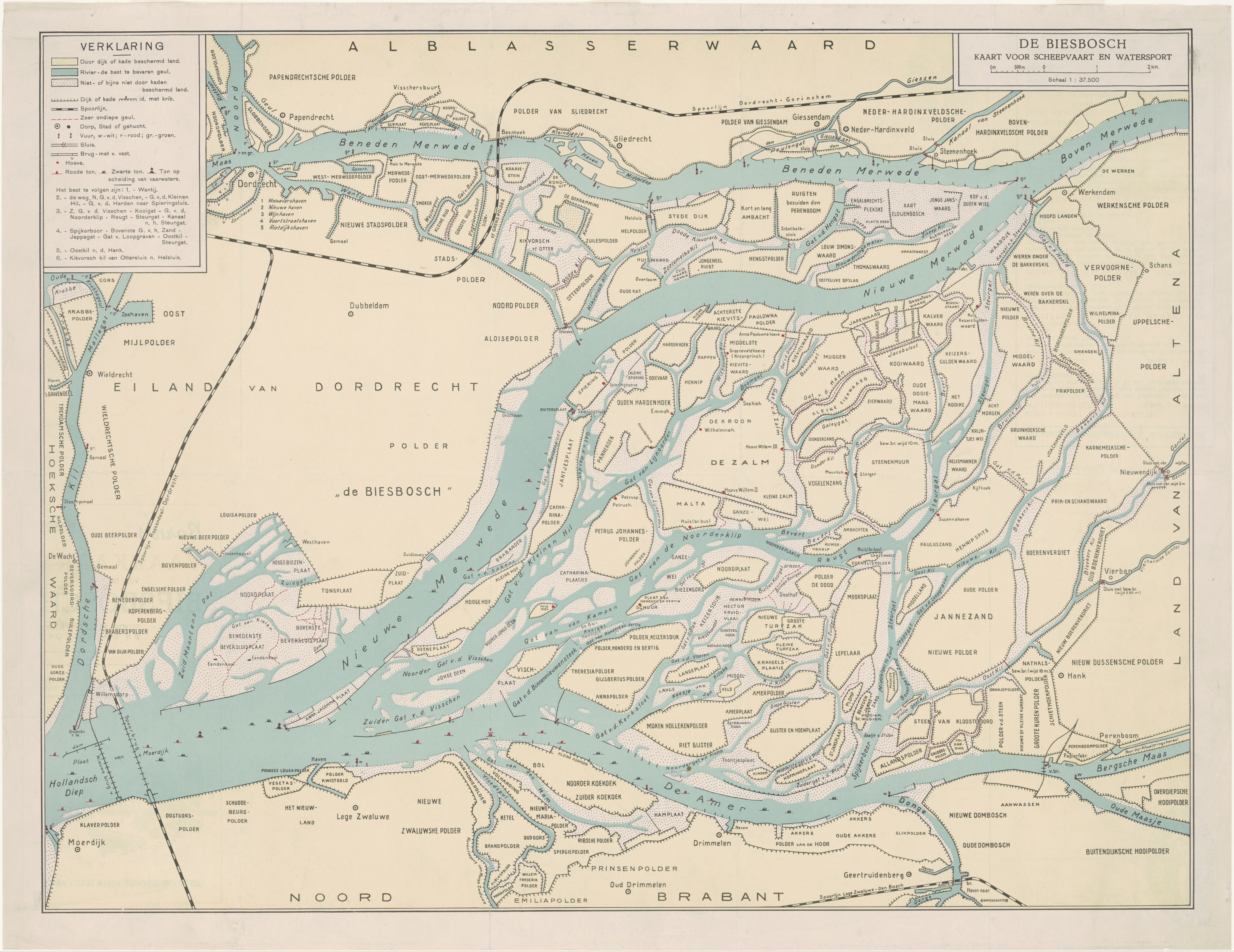 Vaarkaart van de Biesbosch. Met aanduiding van geulen, tonnen, ondiepten enz. Verklaring linksboven. Schaalstok: 3 km. = 80 mm. Schaal 1:37.500.