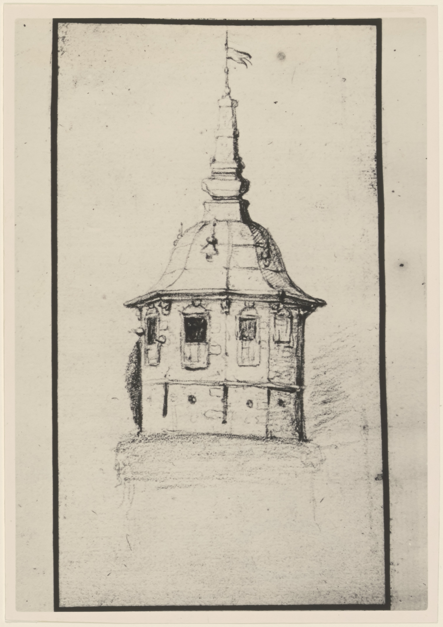 - Tekening van het torentje, de "Draaiom", van de Kloveniersdoelen. De Draaiom is een tafel boven in de torenkamer die kon draaien. Gesloopt in 1857.