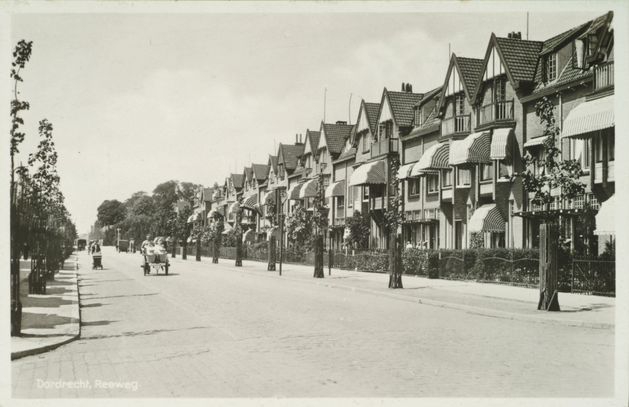 Dit zijn de noord-westelijke woningen aan de Reeweg-Oost met dakkapelletjes en balkonnetjes in de puntgevels, iets wat de gelijkende woningen aan de zuid-oostelijke kant niet hebben. Men kijkt hier dus niet richting Dubbeldam, alhoewel je vroeger in bijna alle richtingen naar Dubbeldam kon kijken, maar richting Krommedijk. Links de Balistraat. Rechts, niet zichtbaar, de Riouwstraat. Zie b.v. ook 552_403207.