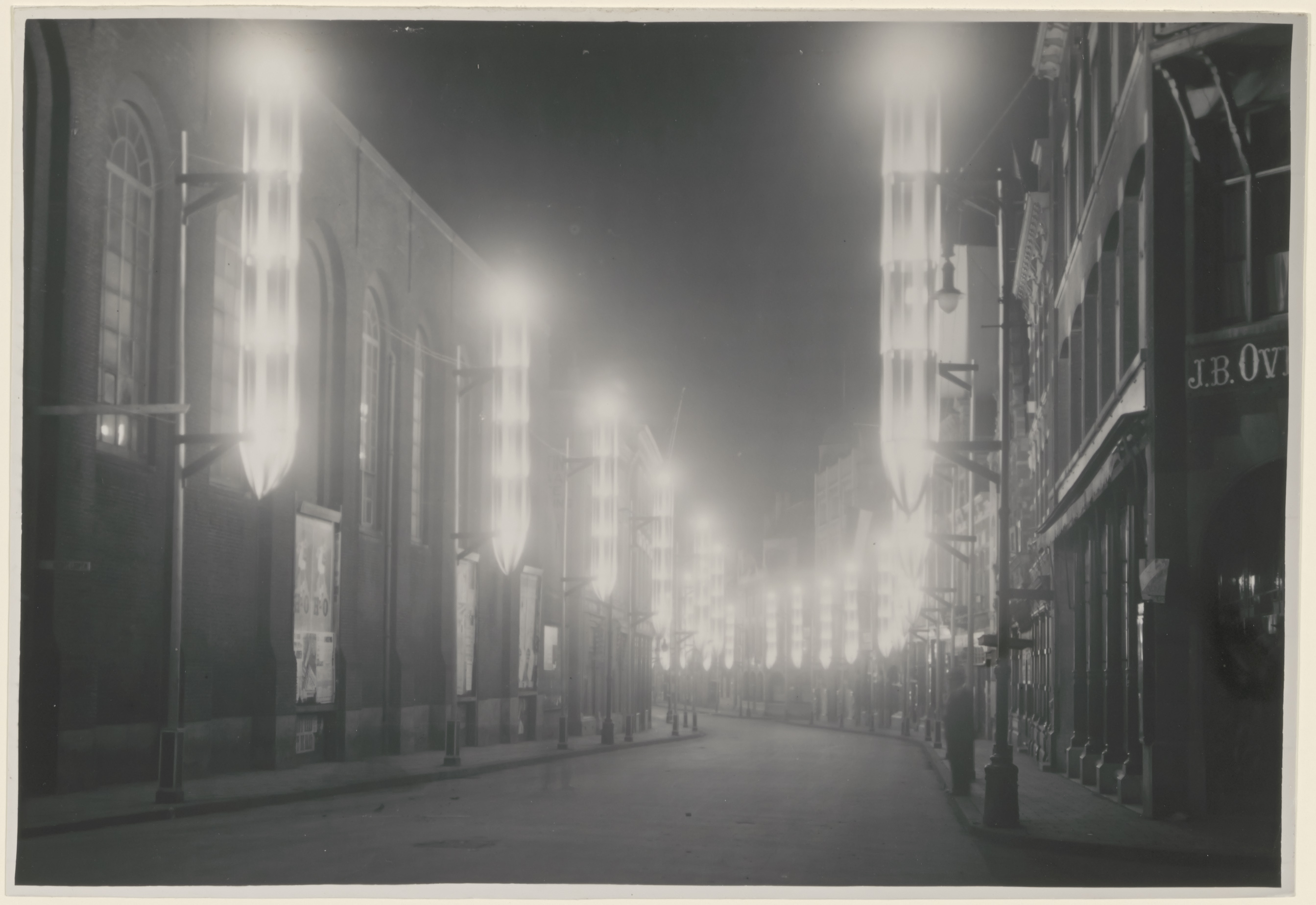 - Verlichting in de Visstraat ter gelegenheid van de feestelijkheden bij de ingebruikneming van de Zeehaven, gezien vanaf de Voorstraat in de richting van het Bagijnhof. Links de Waalse kerk, rechts kledingzaak Overwijn.