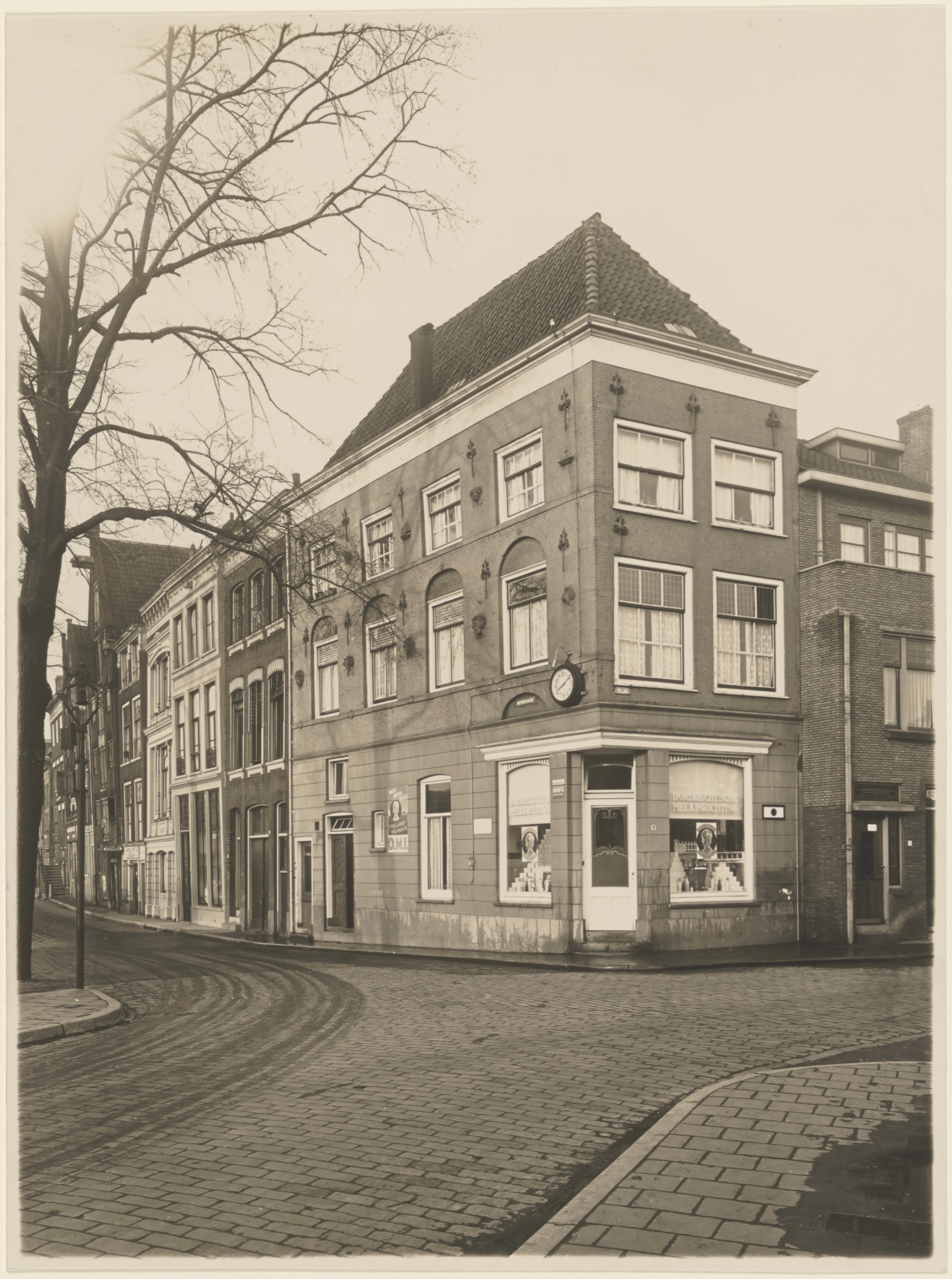- Het Huis met de Hoofden op de hoek van het Vlak en de Nieuwe Haven (links), gezien vanaf de Roobrug.