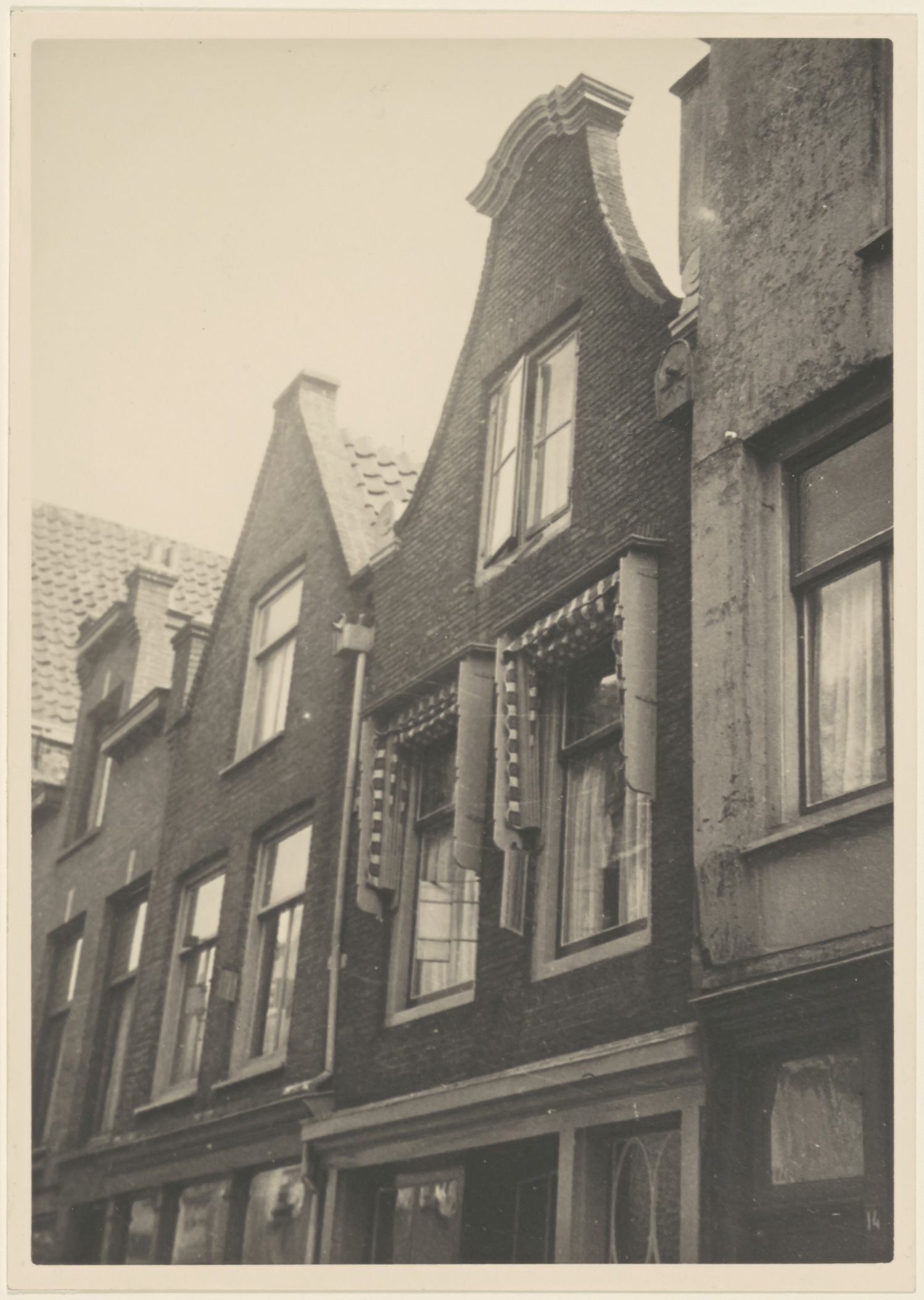 Bovenpuien van huizen aan de noordoostzijde van de Vleeshouwersstraat.