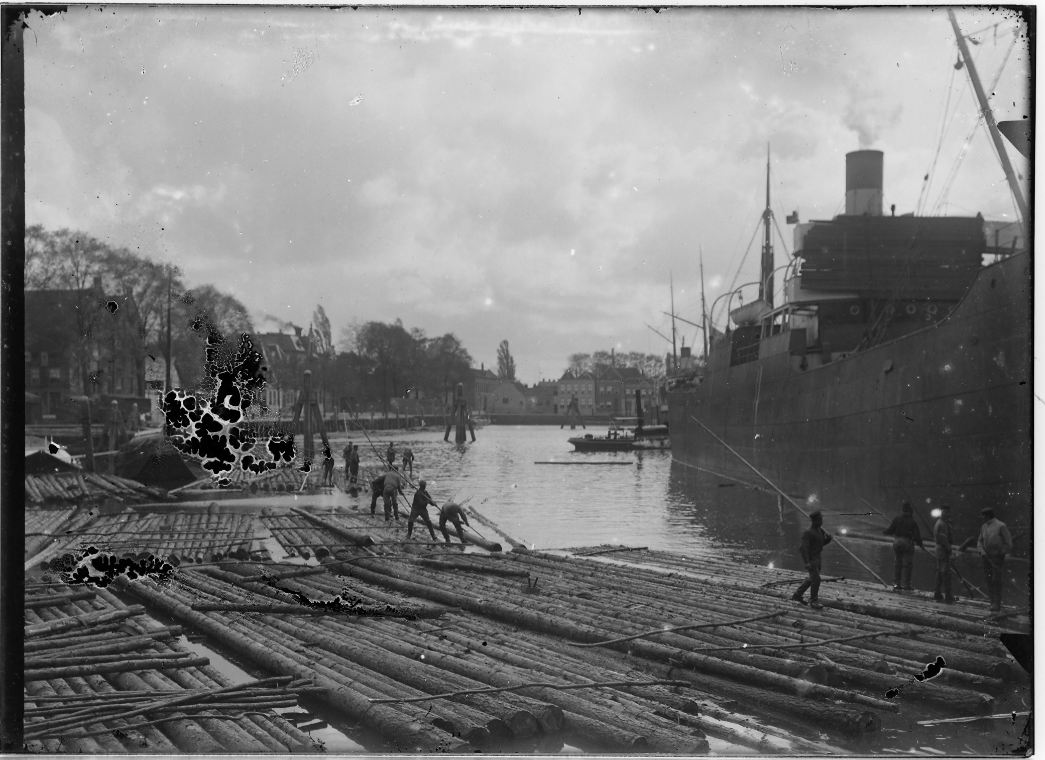 Arbeiders aan het werk op boomstamvlotten in de Kalkhaven