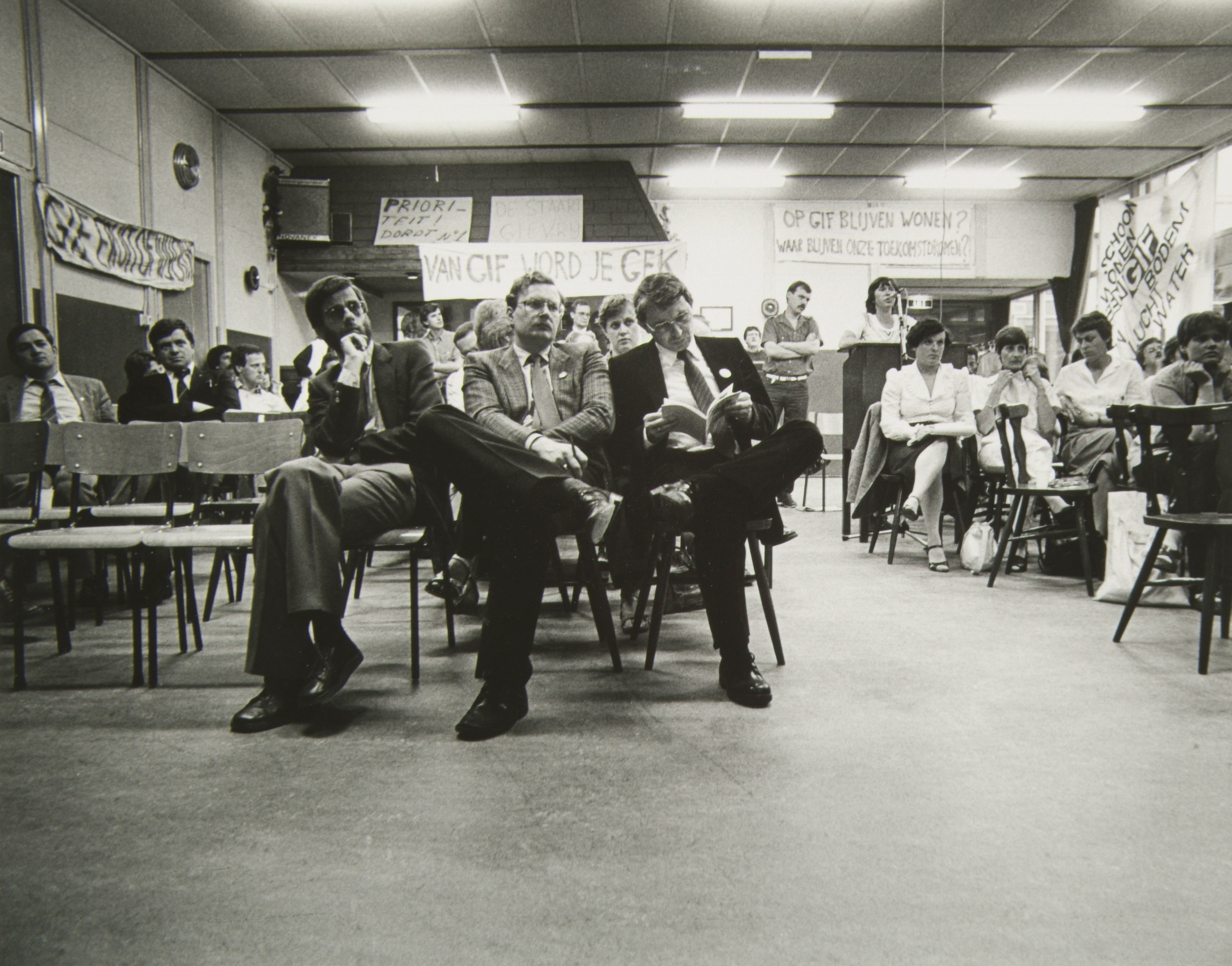 Gemeenteraadsverkiezingen van mei 1982. Politieke bijeenkomst in trefcentrum de Rietschors, Boterdiepstraat. Op de voorgrond v.l.n.r. Jan Bras (DGB), Rob Kooijman (VVD) en Cees Wurth (CDA). Achter de microfoon Janneke Bakker voor haar Co van Brockhoven, Irene Jenner en Adrie Vos allen comité Vervuiling Merwepolder