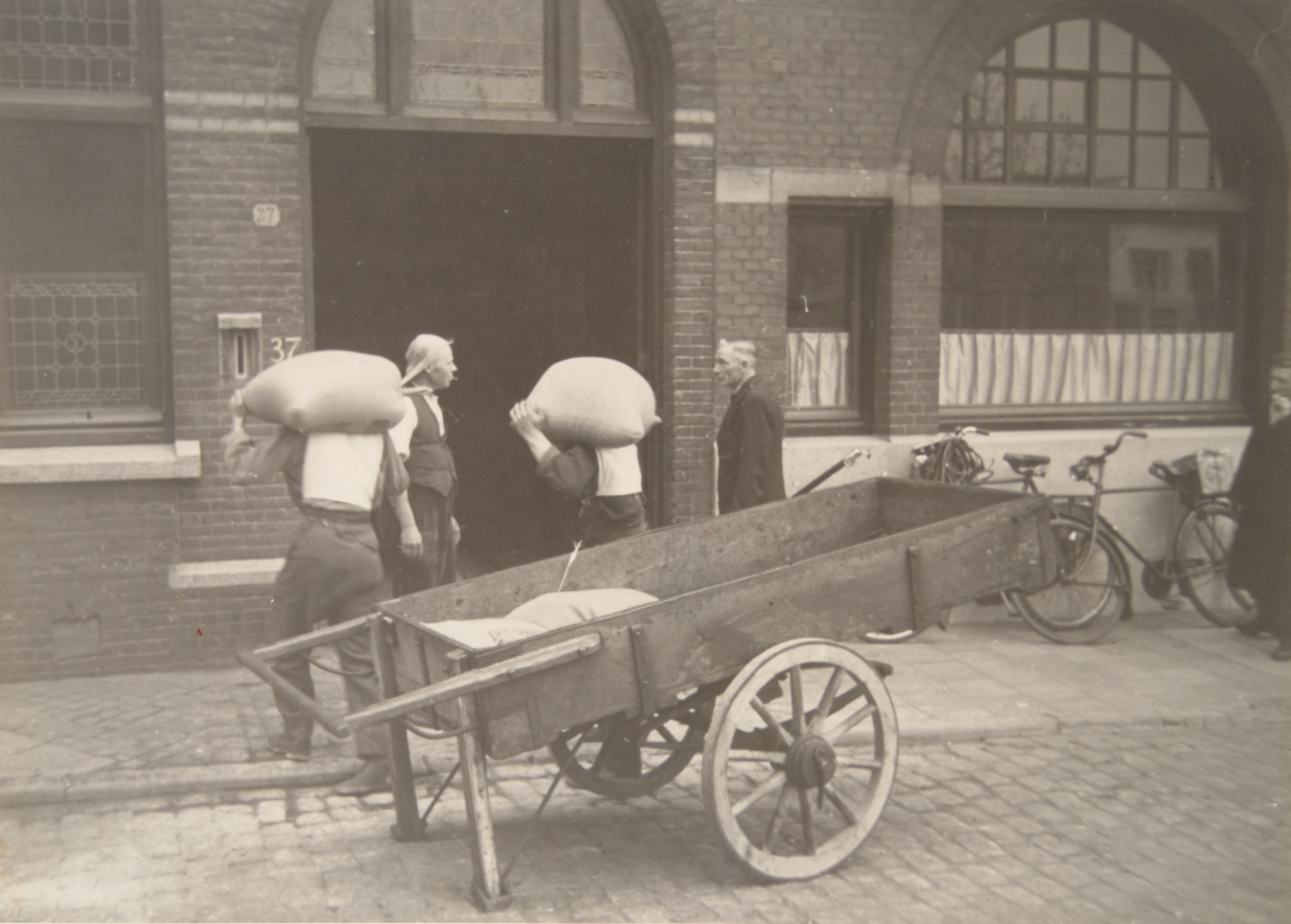 - Meel wordt uit een handkar geladen en binnengebracht bij de firma Roest en Van der Wijk aan de Wolwevershaven 37