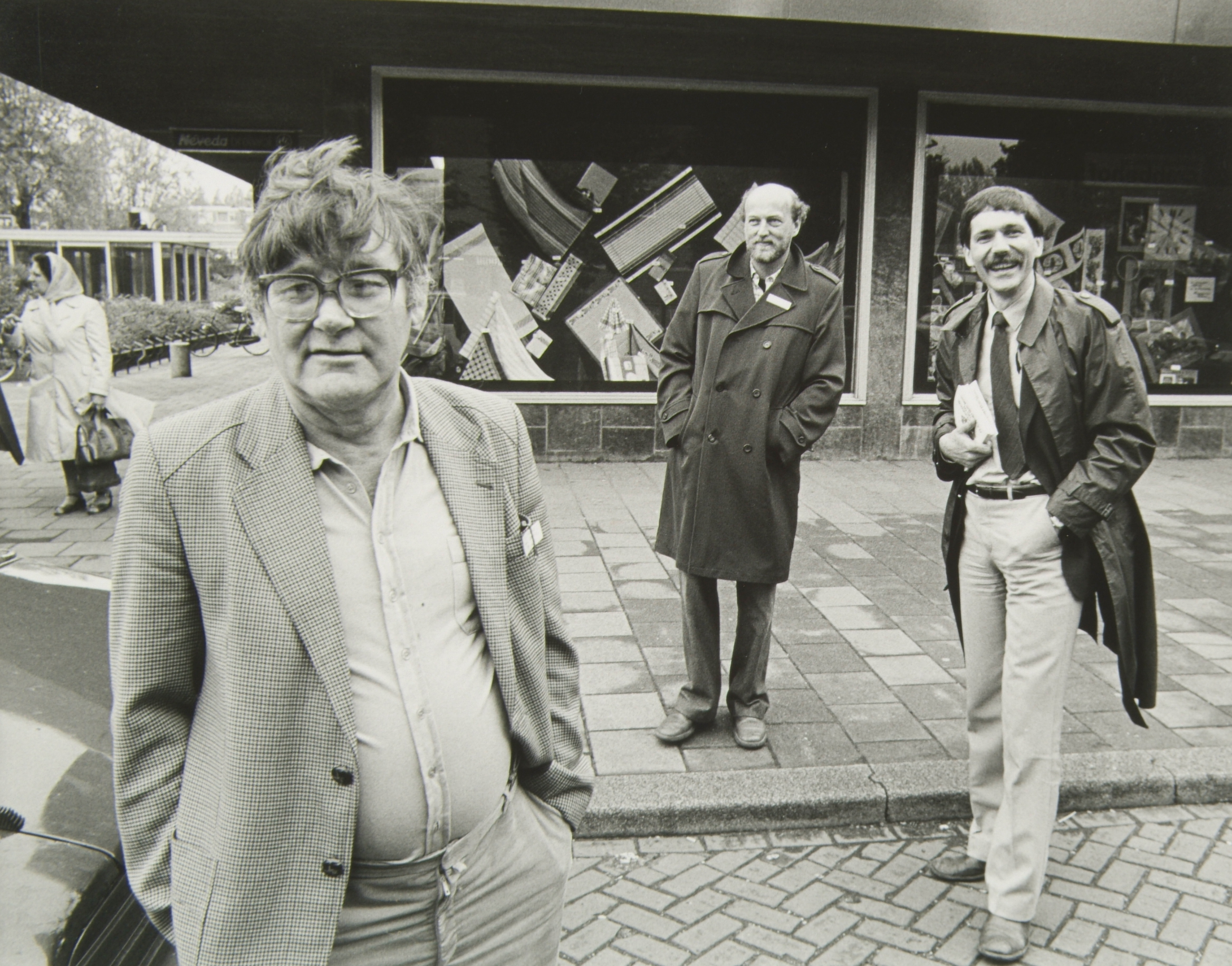 Gemeenteraadsverkiezingen van mei 1982. Verkiezingscampagne op het Van Oldenbarneveltplein. V.l.n.r. Jos Craane (PvdA), Ton de Jong (PvdA) en Nico Maas (VVD).