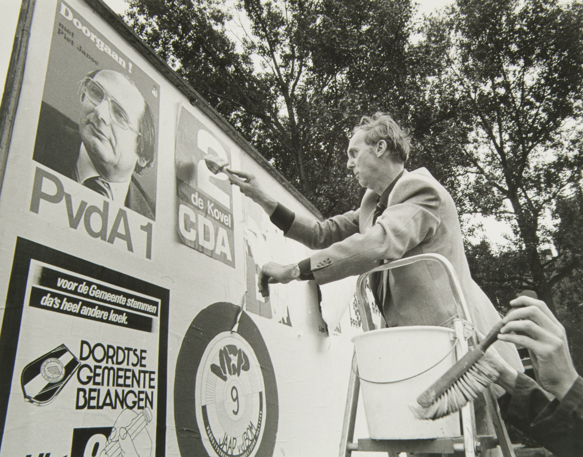 - Gemeenteraadsverkiezingen van mei 1982. Jac. Hogeweg van het CDA plakt een CDA-affiche op het verkiezingsbord op de hoek van de Noordendijk Oranjelaan