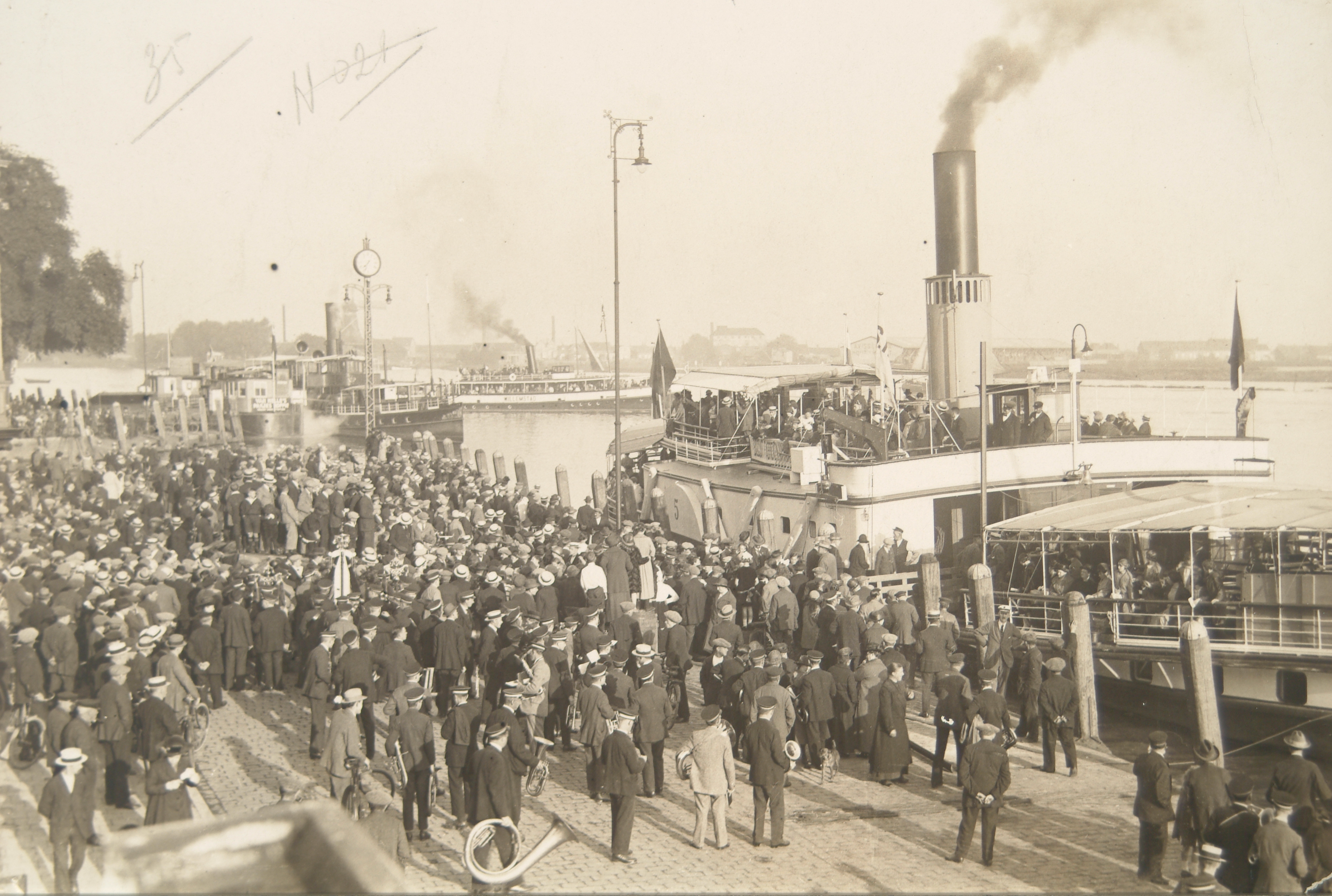 Vertrek van verschillende boten met het personeel van de Chocolade- en biscuitfabriek Victoria van de Merwekade