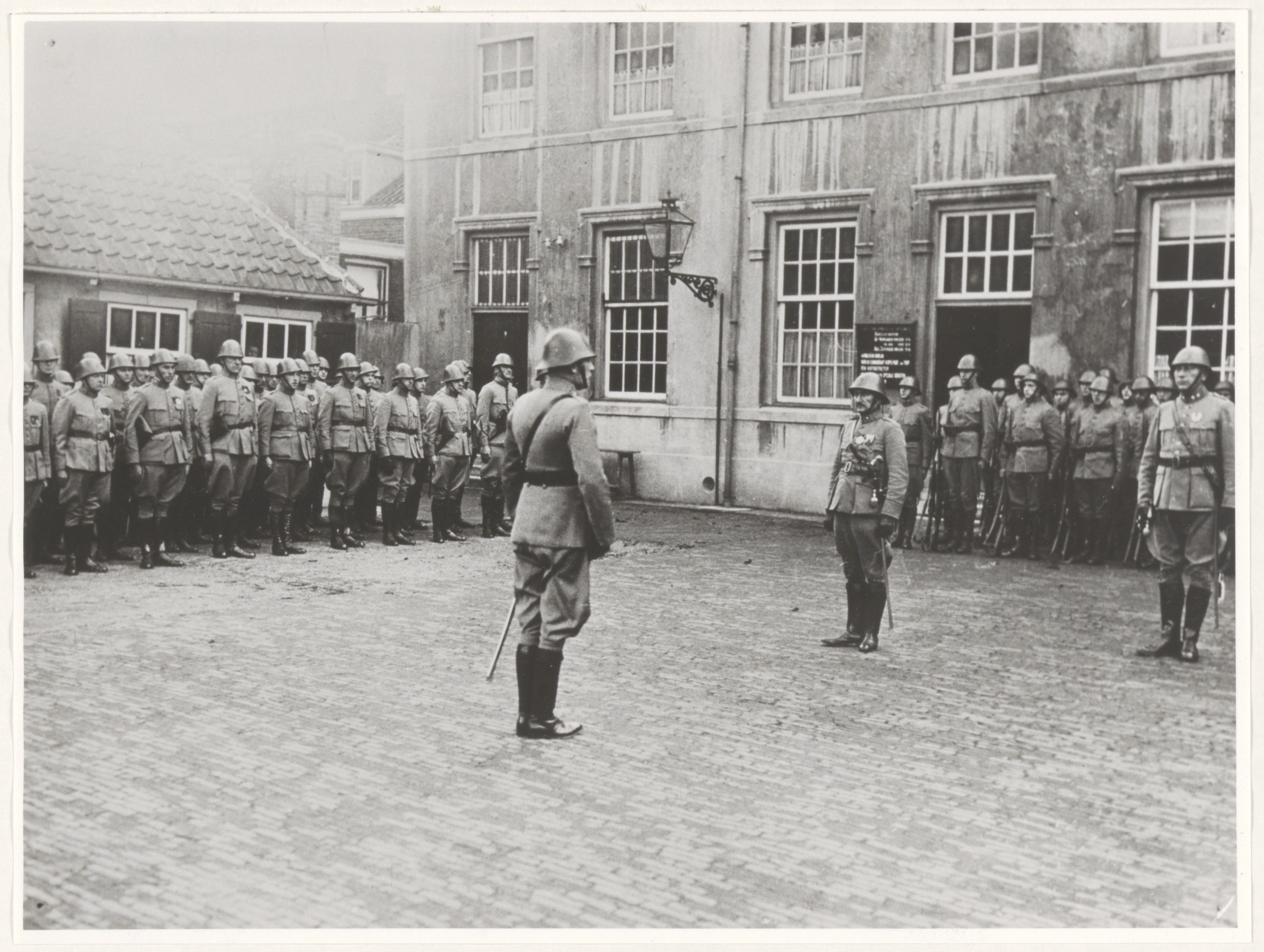 Pontonniers staan aangetreden op de binnenplaats van de kazerne aan de Buiten Walevest …