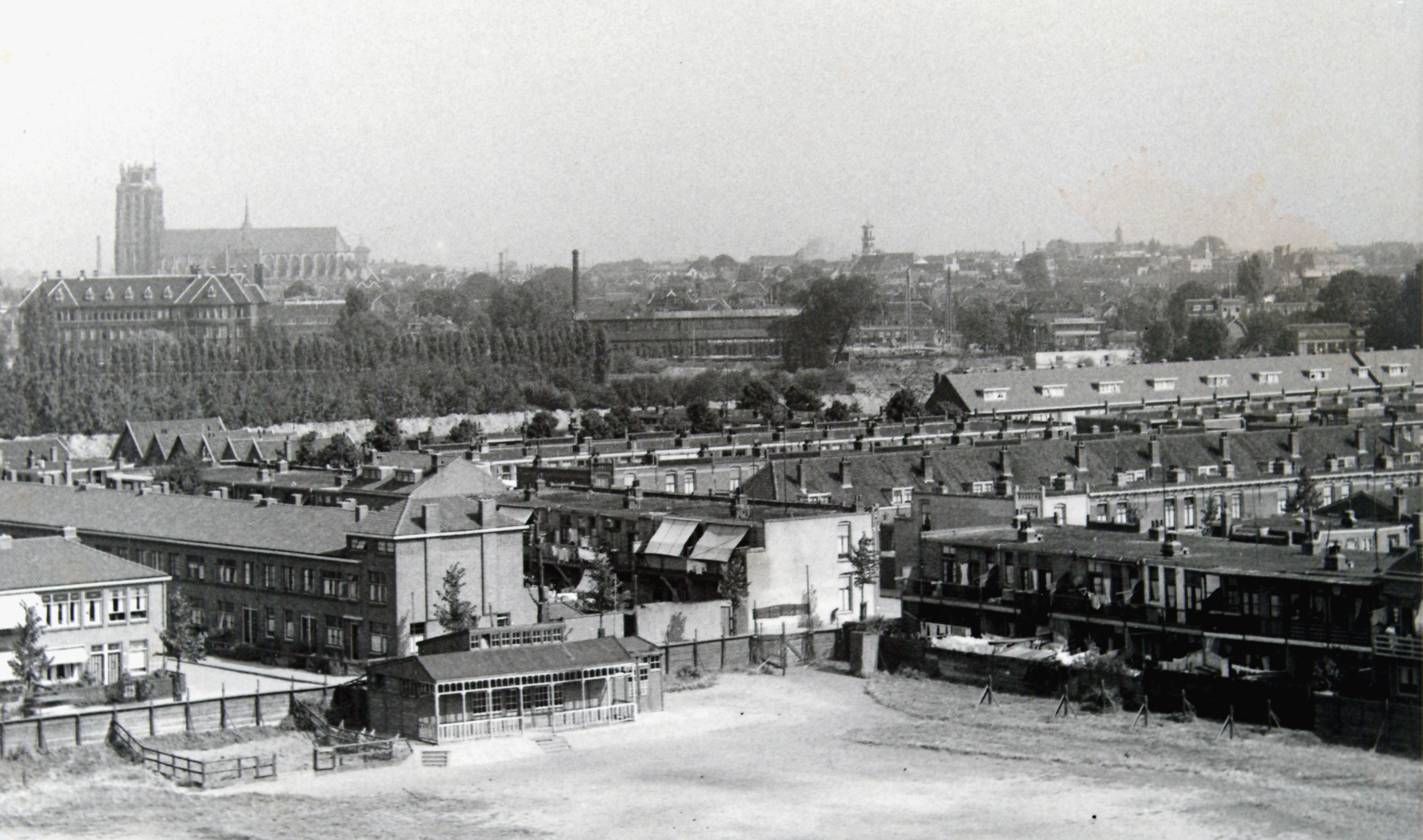 Panorama vanaf de Torenschool aan de Brouwersdijk naar het noorden. Achter de huizen de streep opgeworpen grond voor de rioolkanalen, die in de ontworpen Hugo de Grootlaan worden gelegd. In het midden de oude fabriek van Lips aan de Burgemeester de Raadtsingel. Links voor de Grote Kerk het gebouw van verzekeringsmaatschappij Eerste Nederlandsche aan de Havenstraat.