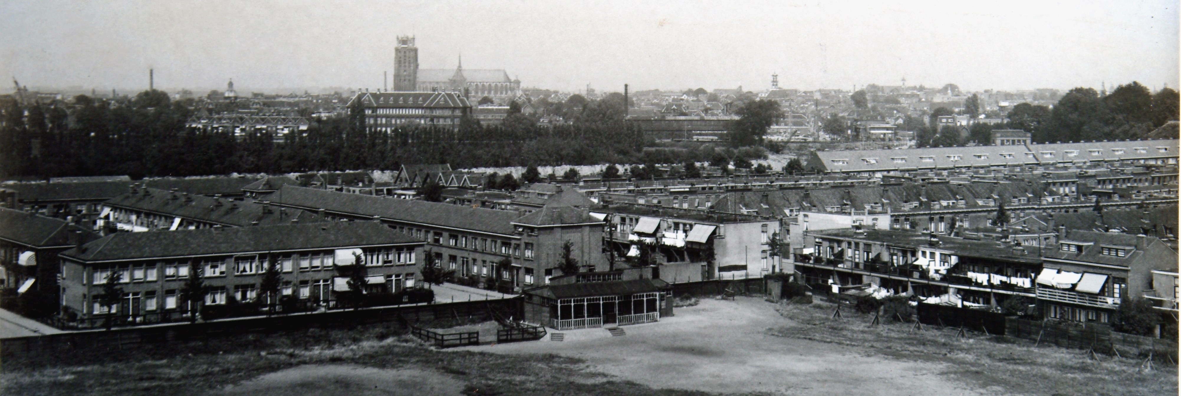 - Panorama vanaf de Torenschool aan de Brouwersdijk naar het noorden. Voor de Grote Kerk het Refaja Ziekenhuis aan de Havenstraat, rechts daarvan de oude fabriek van Lips aan de Burgemeester de Raadtsingel.