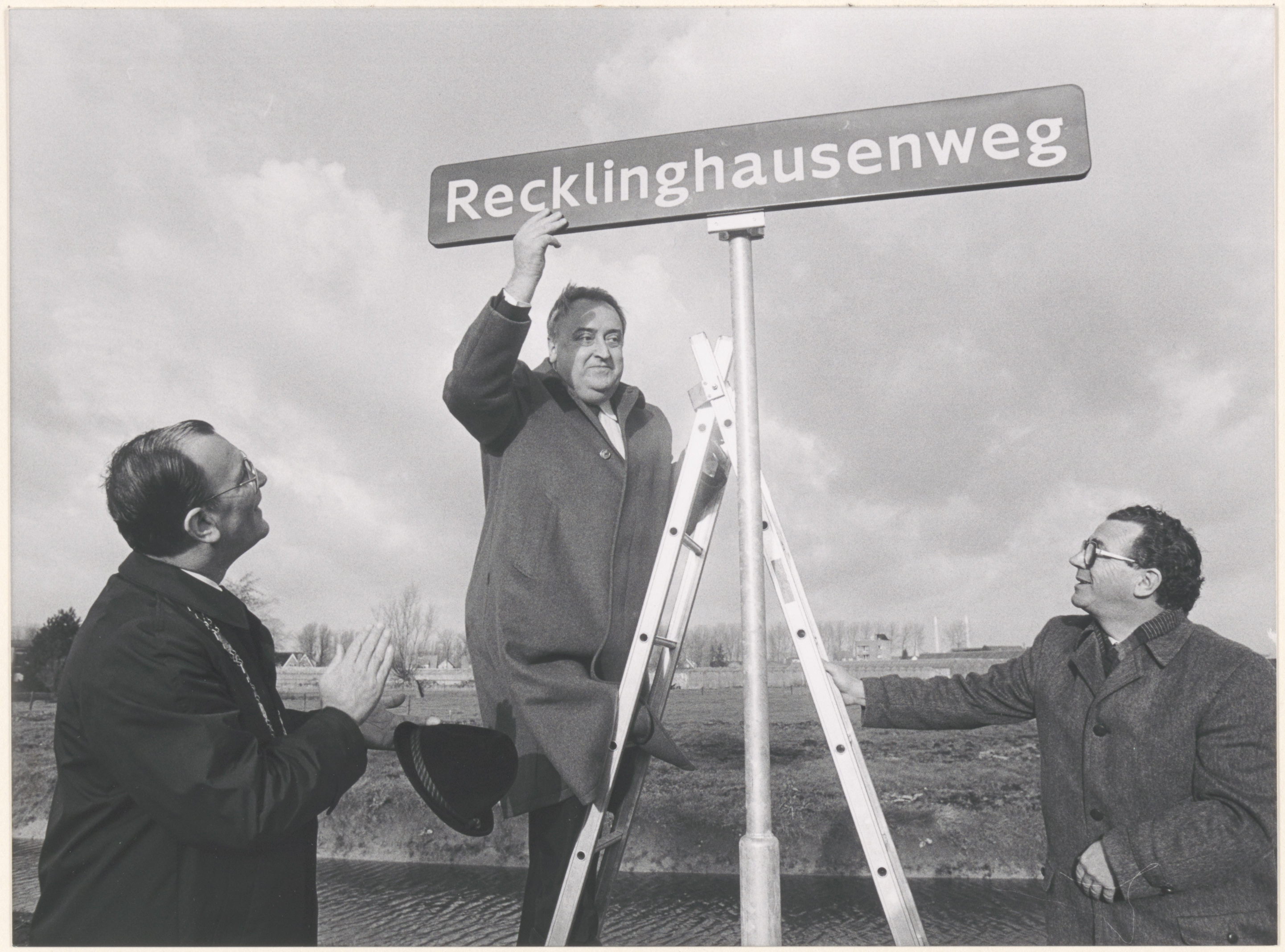 - Plaatsing van het straatnaambord aan de Recklinghausenweg. Links burgemeester J. Noorland. De man op de ladder is de burgemeester van Recklinghausen.