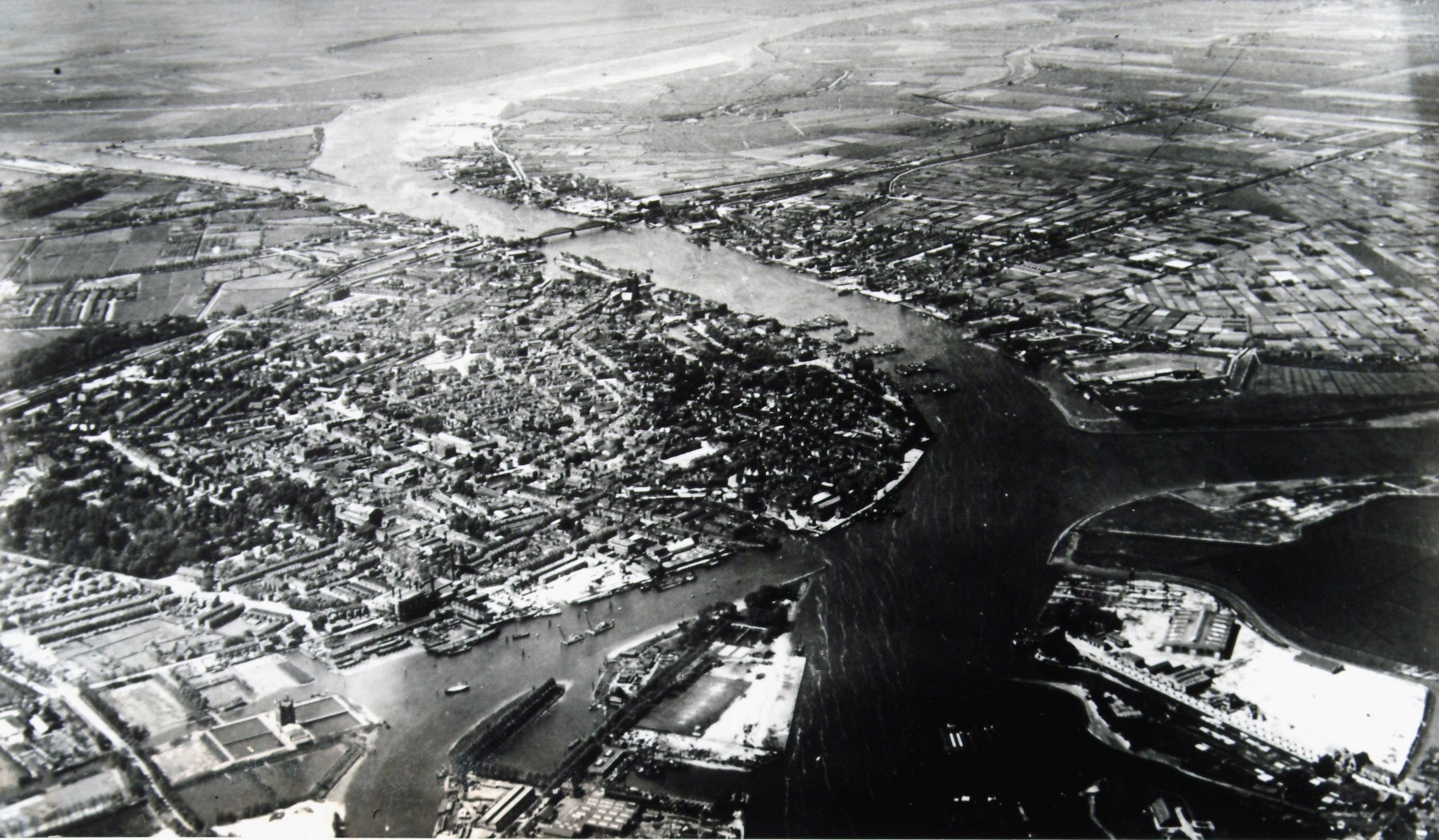 Panorama over Dordrecht (links), Zwijndrecht en Papendrecht (rechtsonder). Rivieren, van rechts met de klok mee: Noord, Merwede, Wantij, Oude Maas, linksboven het Mallegat.