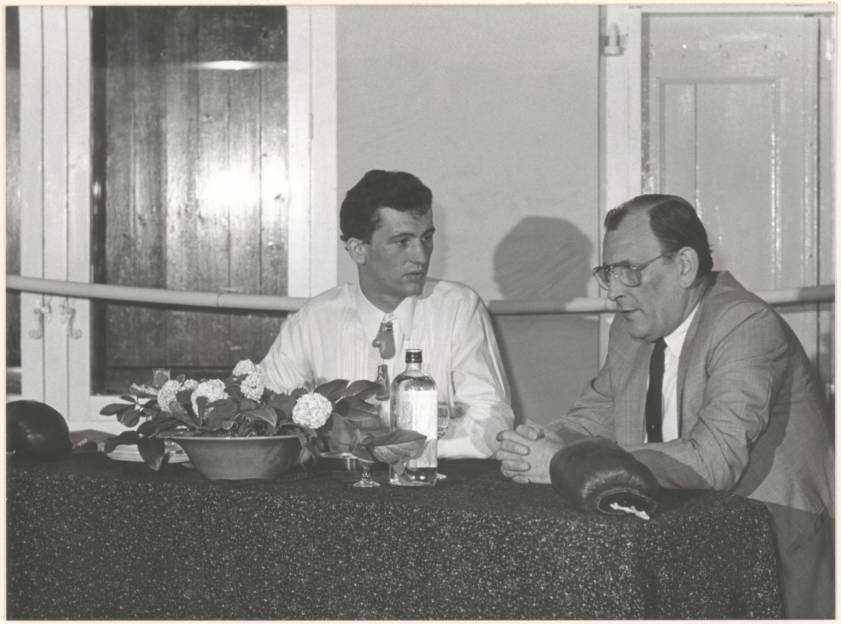 Ed van Munster interviewt burgemeester J. Noorland in zijn progamma 'In de Ring' in café Merz aan de Korte Kalkhaven. Op de tafel een paar bokshandschoenen die de titel van het progamma illustreren.