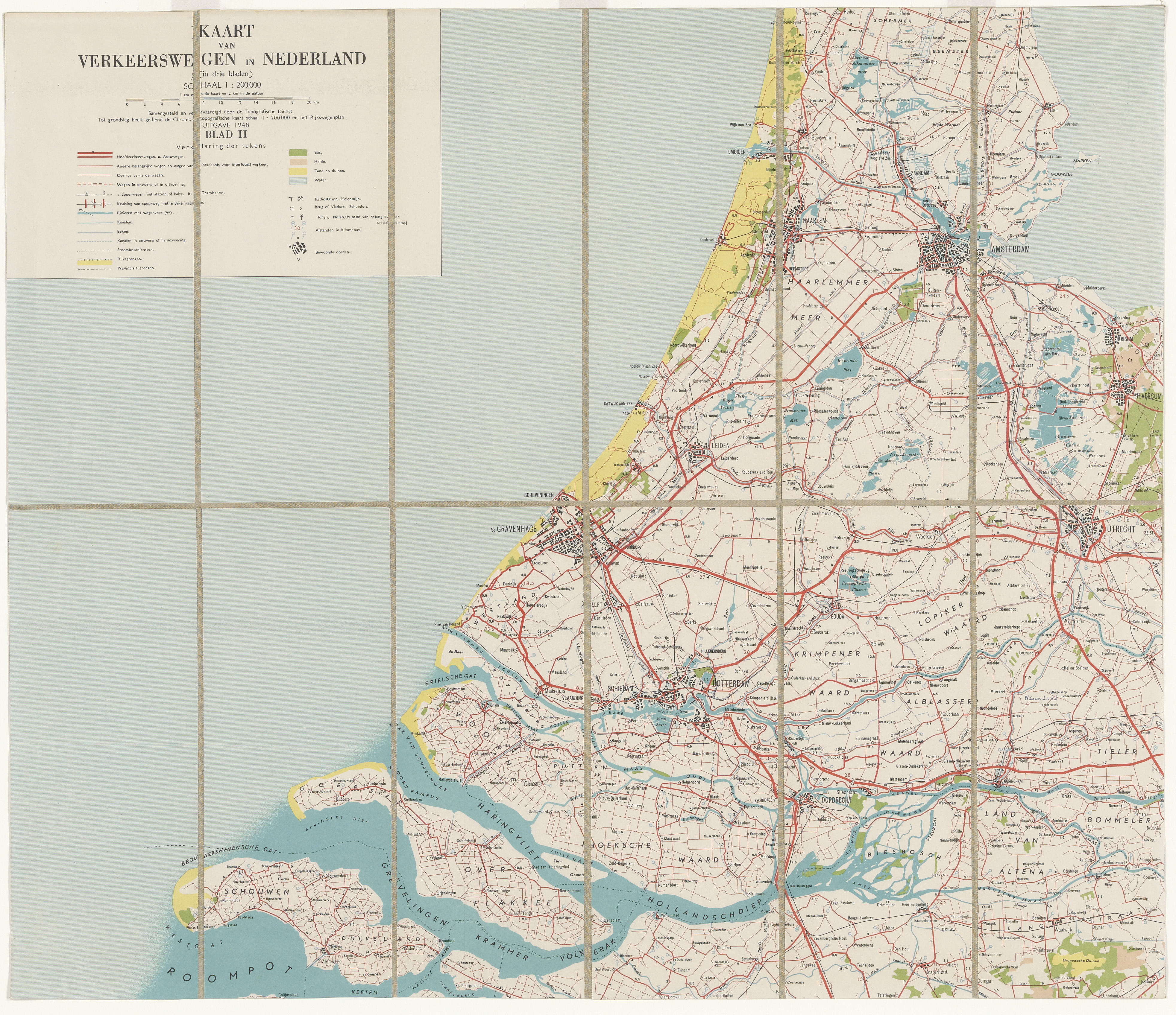 - Middenblad van de kaart van verkeerswegen in Nederland: westelijk Utrecht, Zuid-Holland, zuidelijk Noord-Holland, noordwestelijk Noord-Brabant en Schouwen-Duiveland.