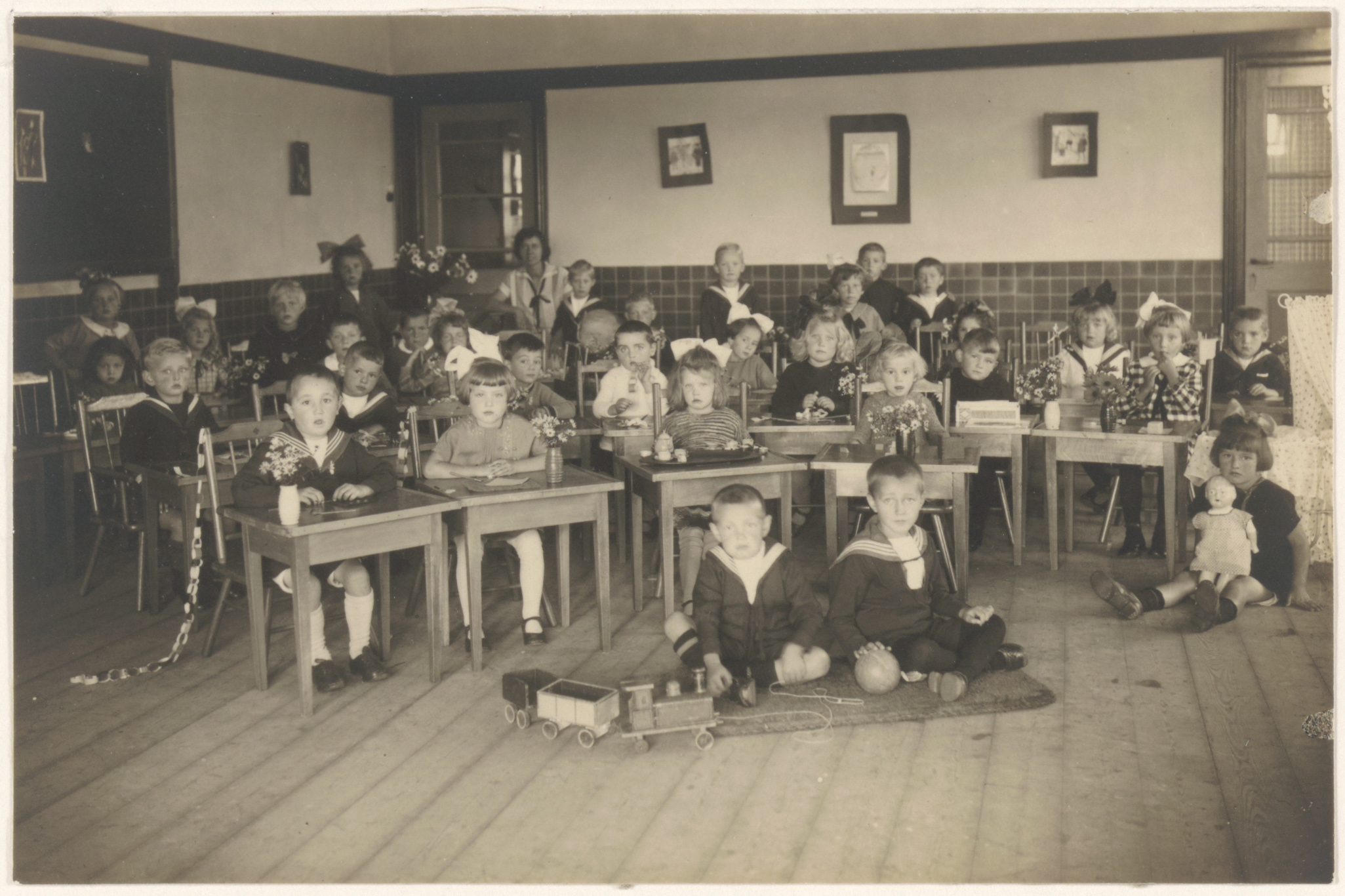 bewaar- / fröbel- / kleuterscholen klaslokalen klassenfoto's / schoolfoto's leerlingen / scholieren onderwijzers schoolbanken
