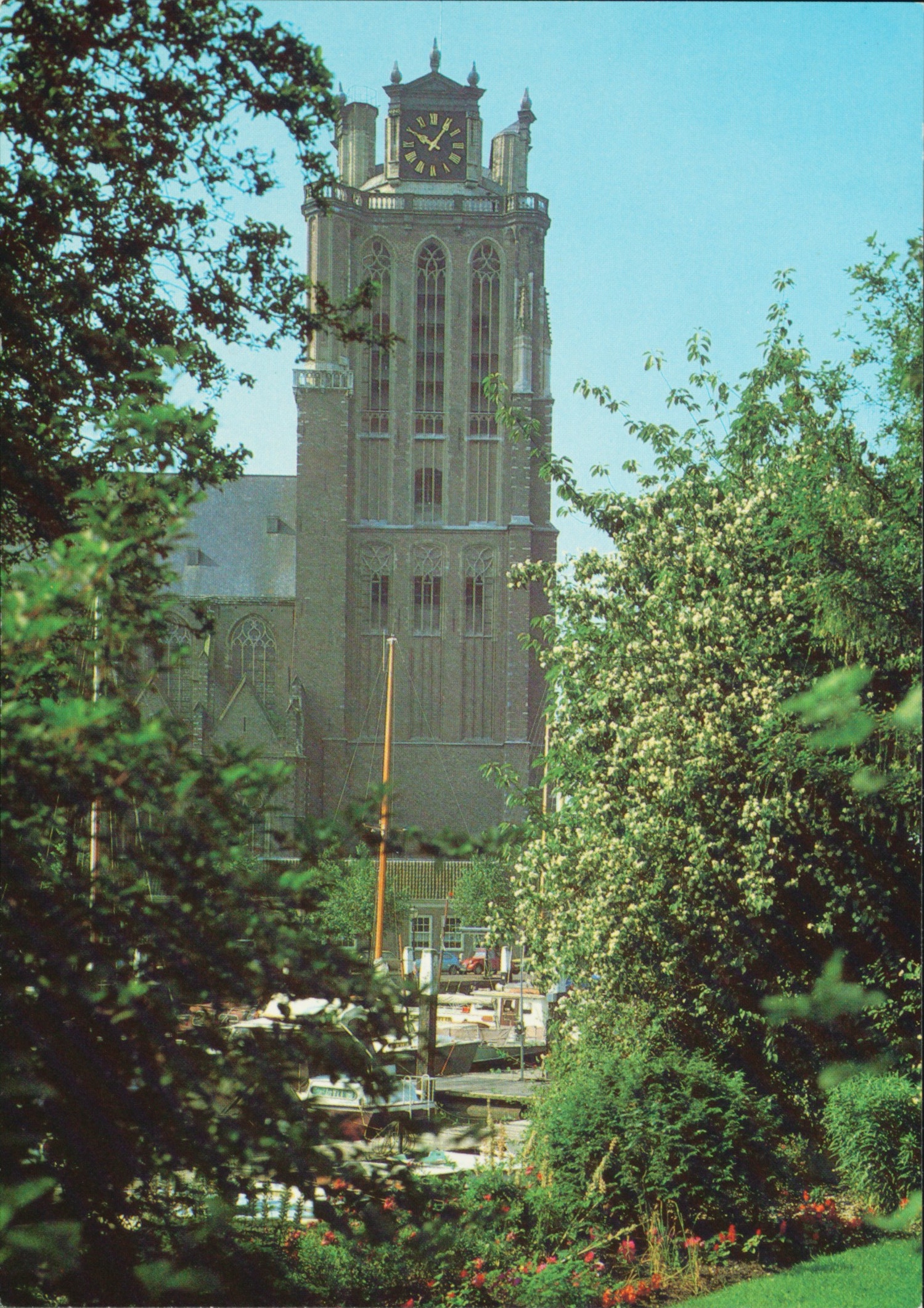 Toren van de laatgotische Grote of Onze Lieve Vrouwenkerk. In het Zomerseizoen kan men de 72m hoge toren beklimmen en genieten van een prachtig uitzicht over de rivier en het oude Dordtse Havenkwartier.