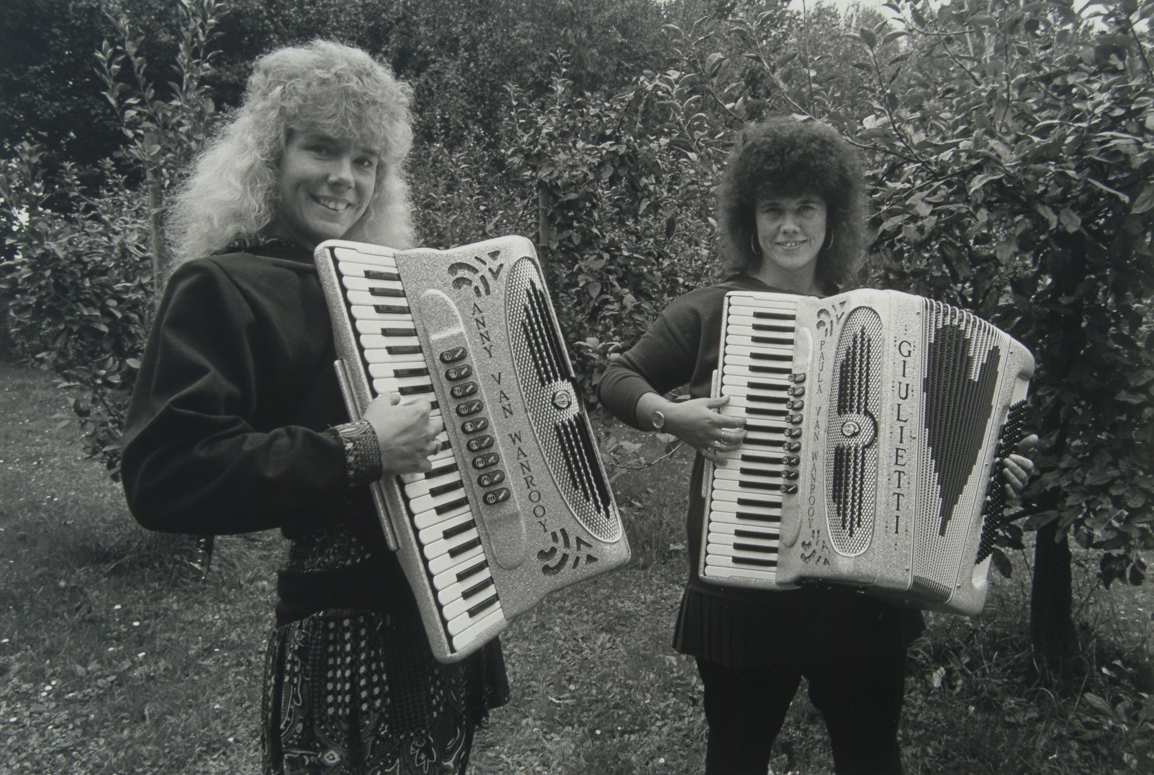Muzikale zusjes Wanrooij uit Klaaswaal met hun accordeons in een appelboomgaard