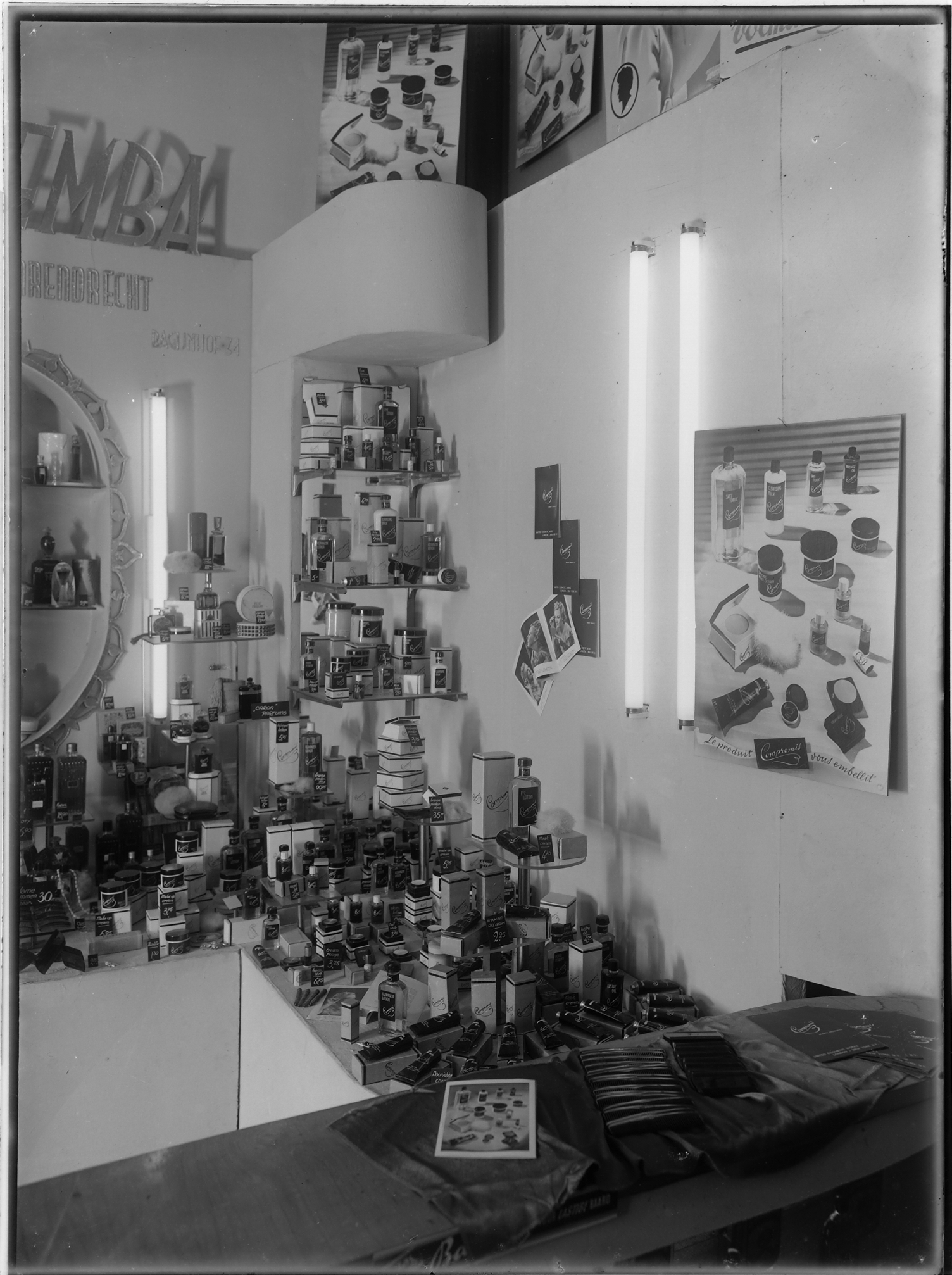 Stand van parfumerie Emba (fam. Barendrecht) in de Vriesestraat op de DAWET in Kunstmin