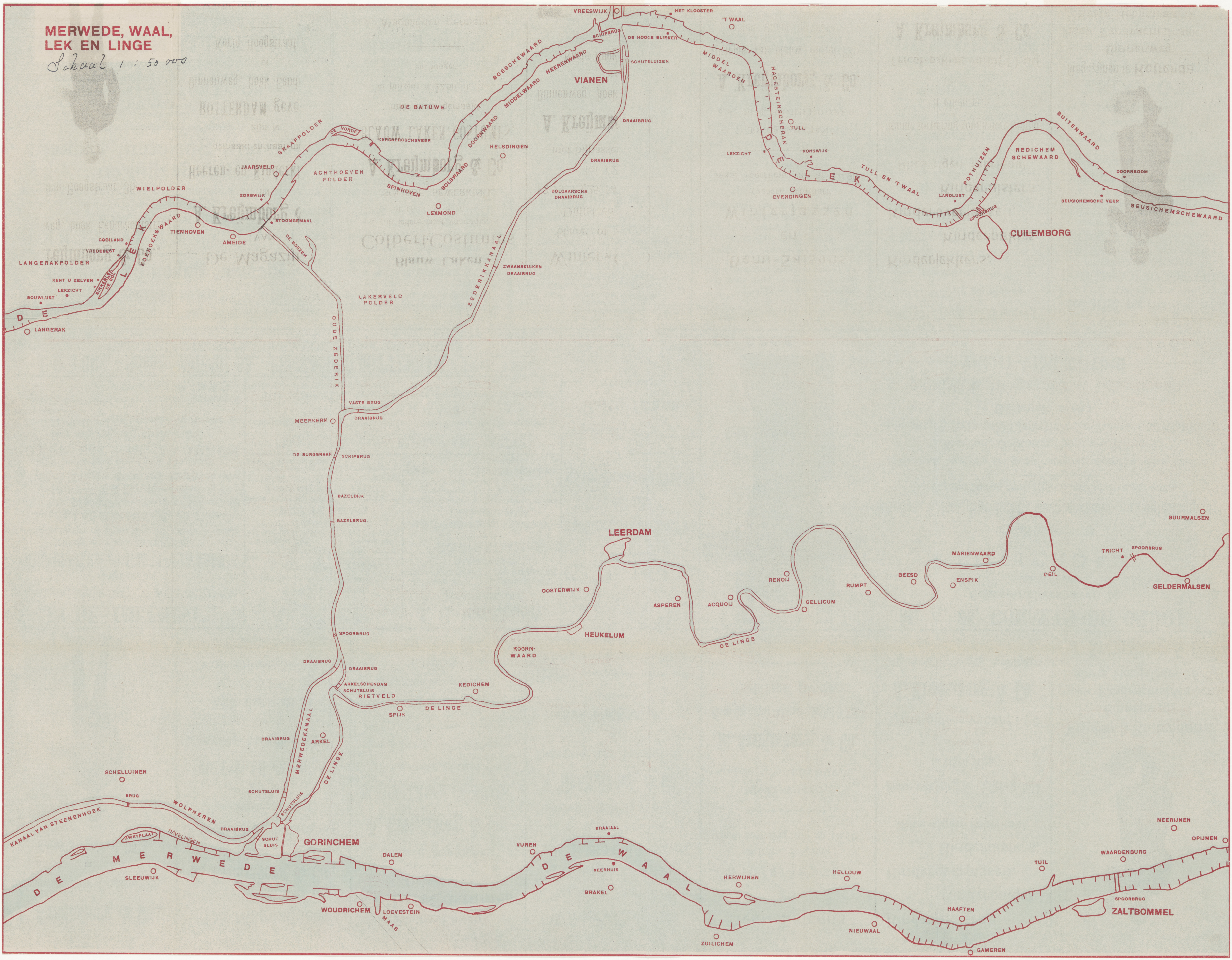 - Kaart van de rivierenloop tussen Sleeuwijk, Zaltbommel, Culemborg en Langerak. Verso: diverse advertentiés Rotterdam. Noorden boven. Schaal 1:50.000.
