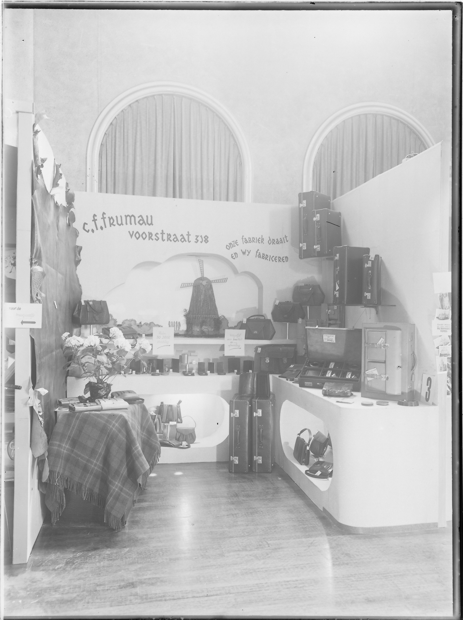 Stand van de firma in lederwaren C.F. Frumau op de Voorstraat op de DAWET in Kunstmin