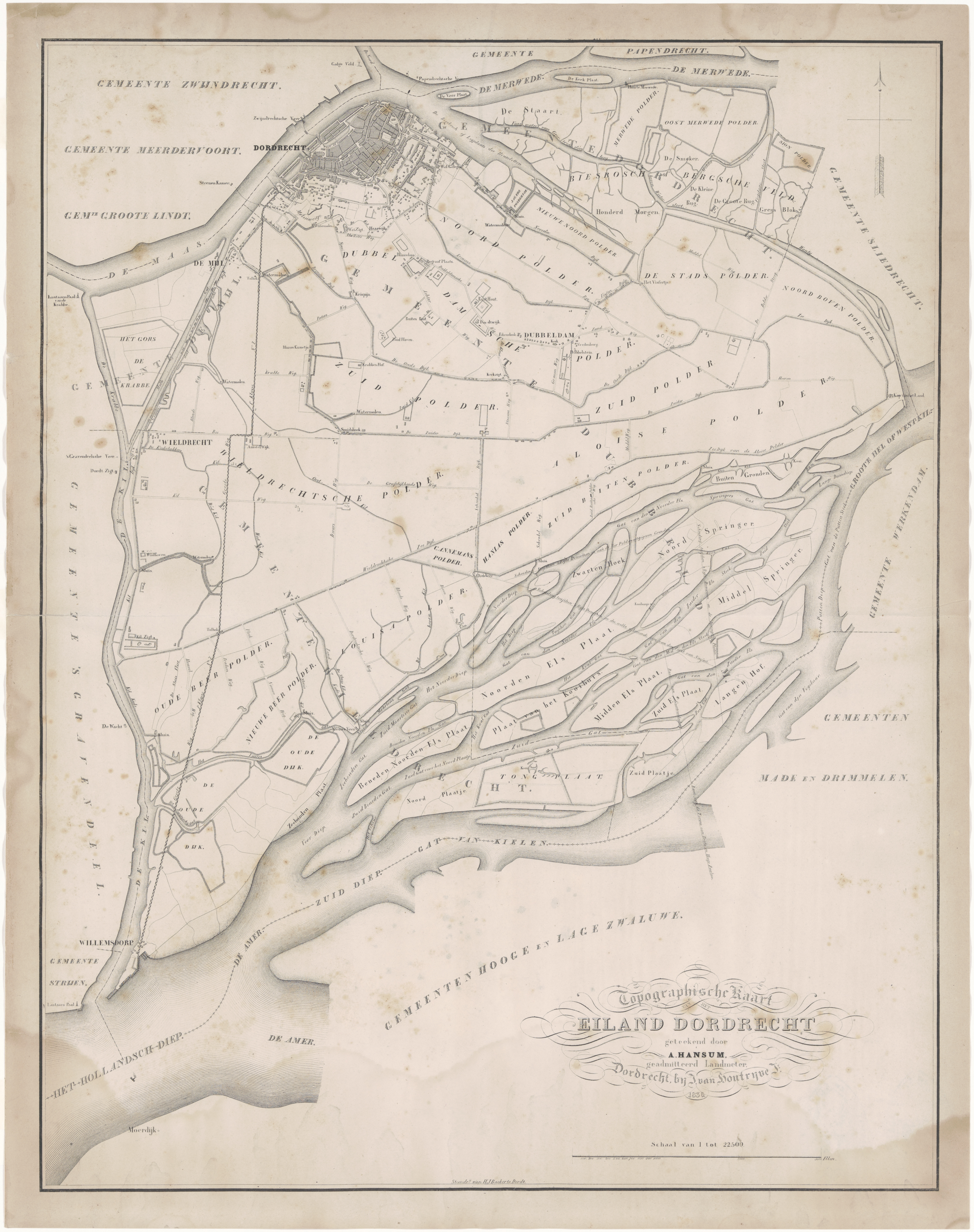 - Het eiland van Dordrecht met daarop onder andere aangegeven de wegen en waterlopen, dijken, sluizen en bebouwing.