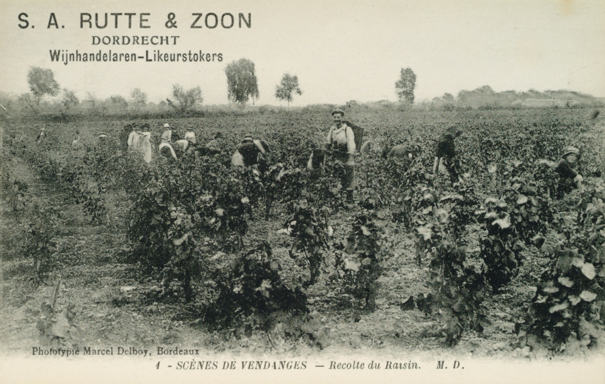 Druivenoogst in de omgeving van Bordeaux. Reclame van S.A. Rutte & Zoon, Wijnhandelaren-Likeurstokers.