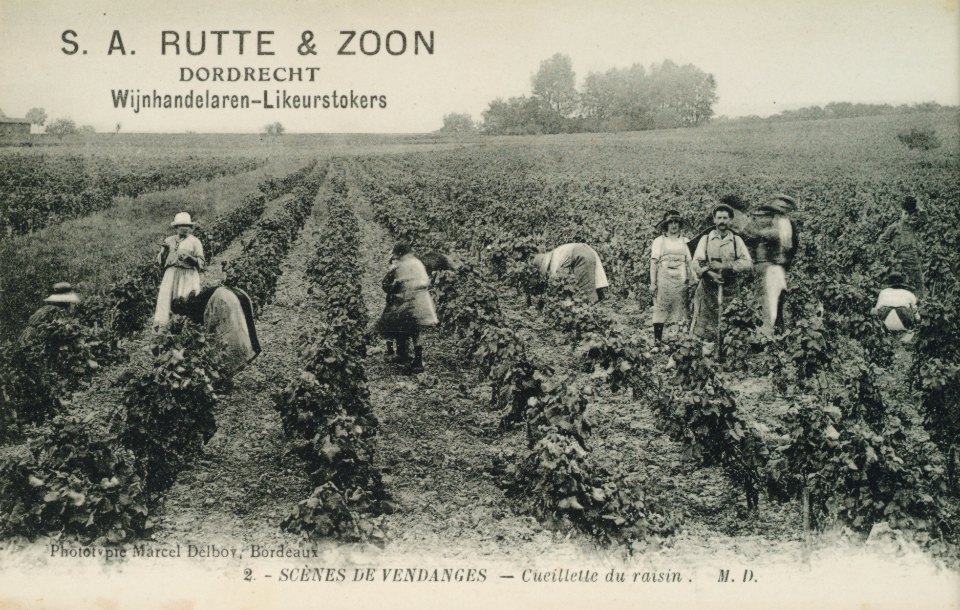 - Druivenoogst in de omgeving van Bordeaux. Reclame van S.A. Rutte & Zoon, Wijnhandelaren-Likeurstokers.