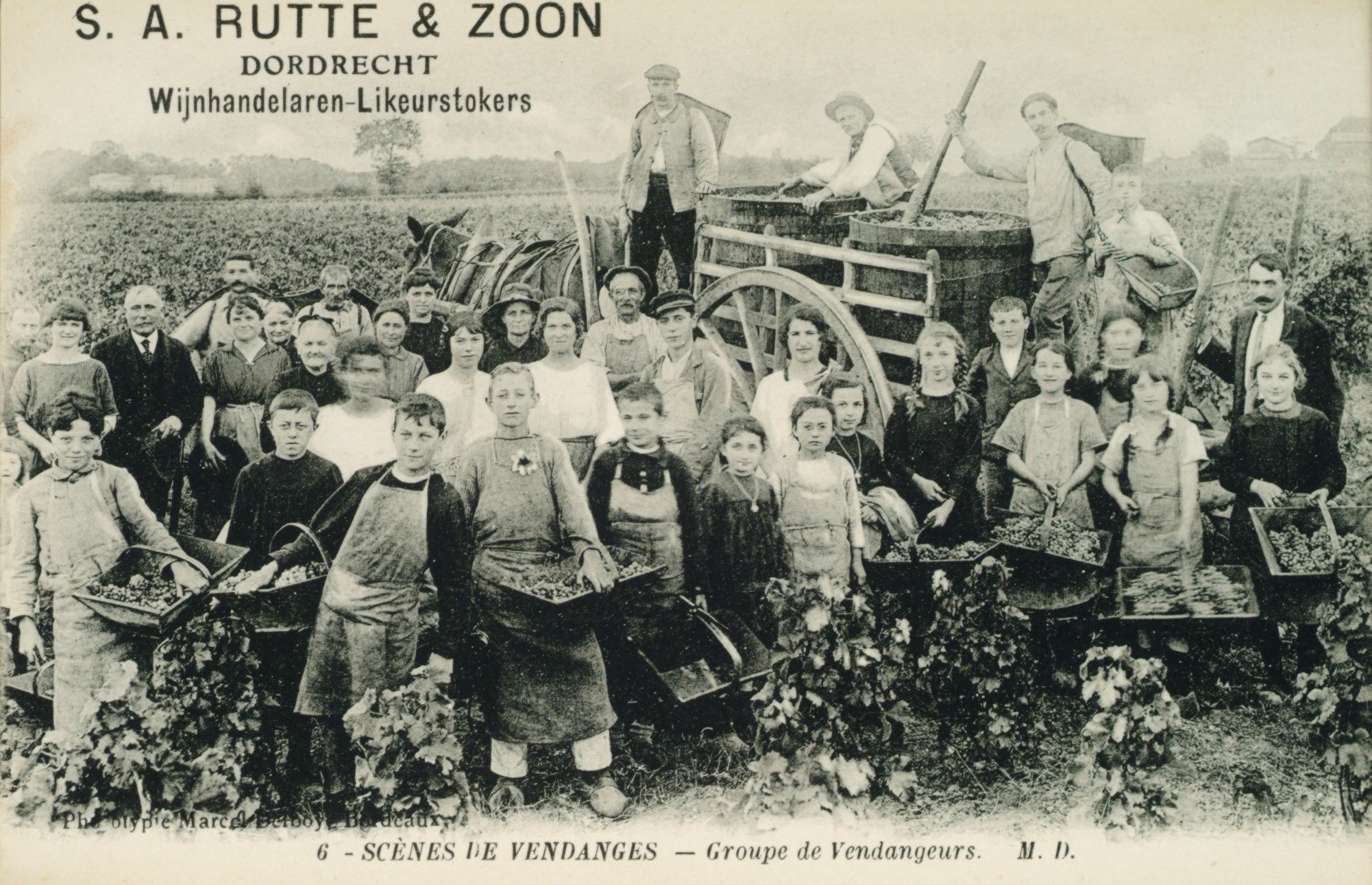 - Druivenoogst in de omgeving van Bordeaux. Reclame van S.A. Rutte & Zoon, Wijnhandelaren-Likeurstokers.