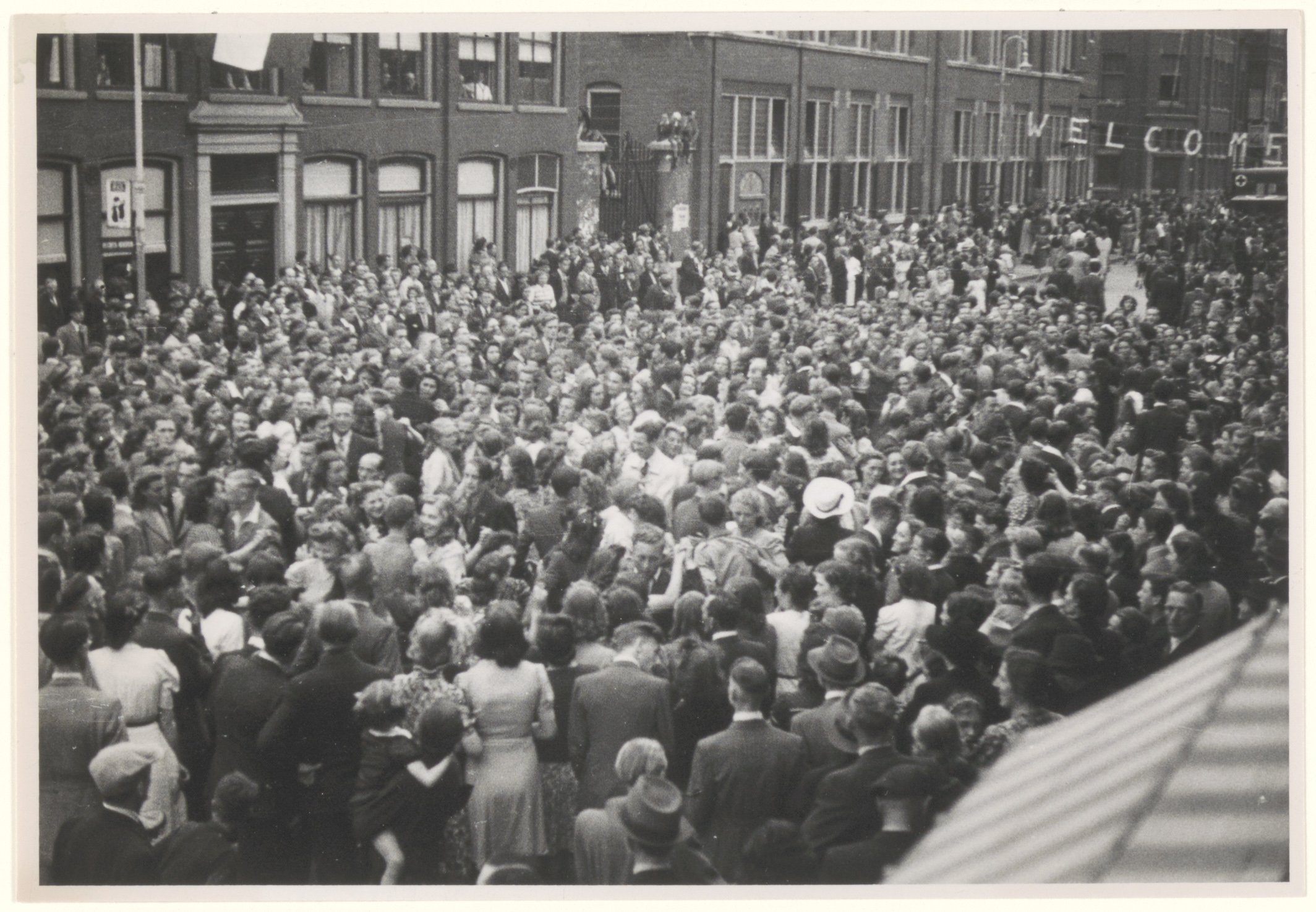 - Een mensenmenigte op het Bagijnhof die de Canadese bevrijders verwelkomt; links het bestedelingenhuis en het postkantoor.