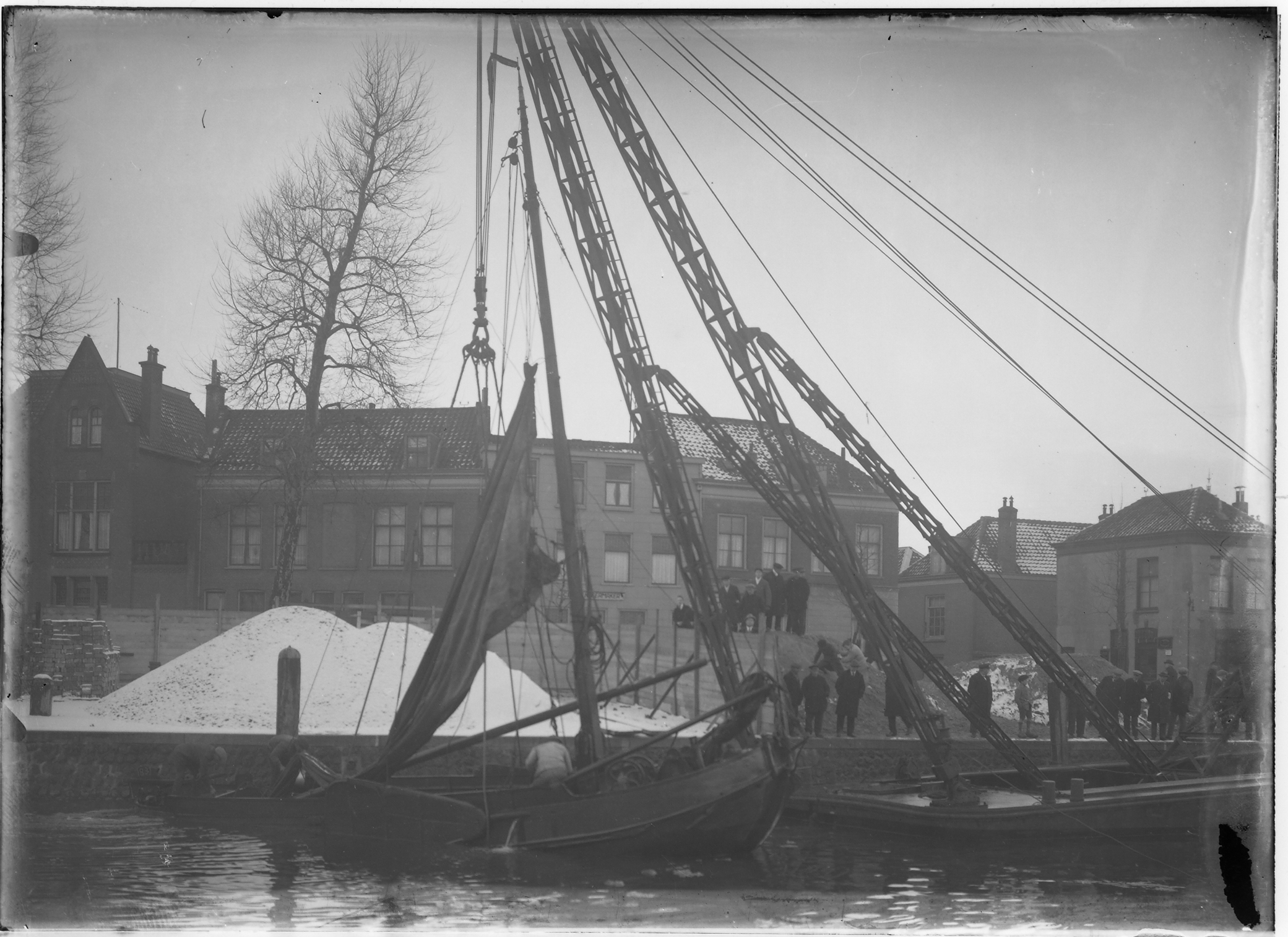Het lichten van een zandschuit in de Spuihaven panden aan de Vest