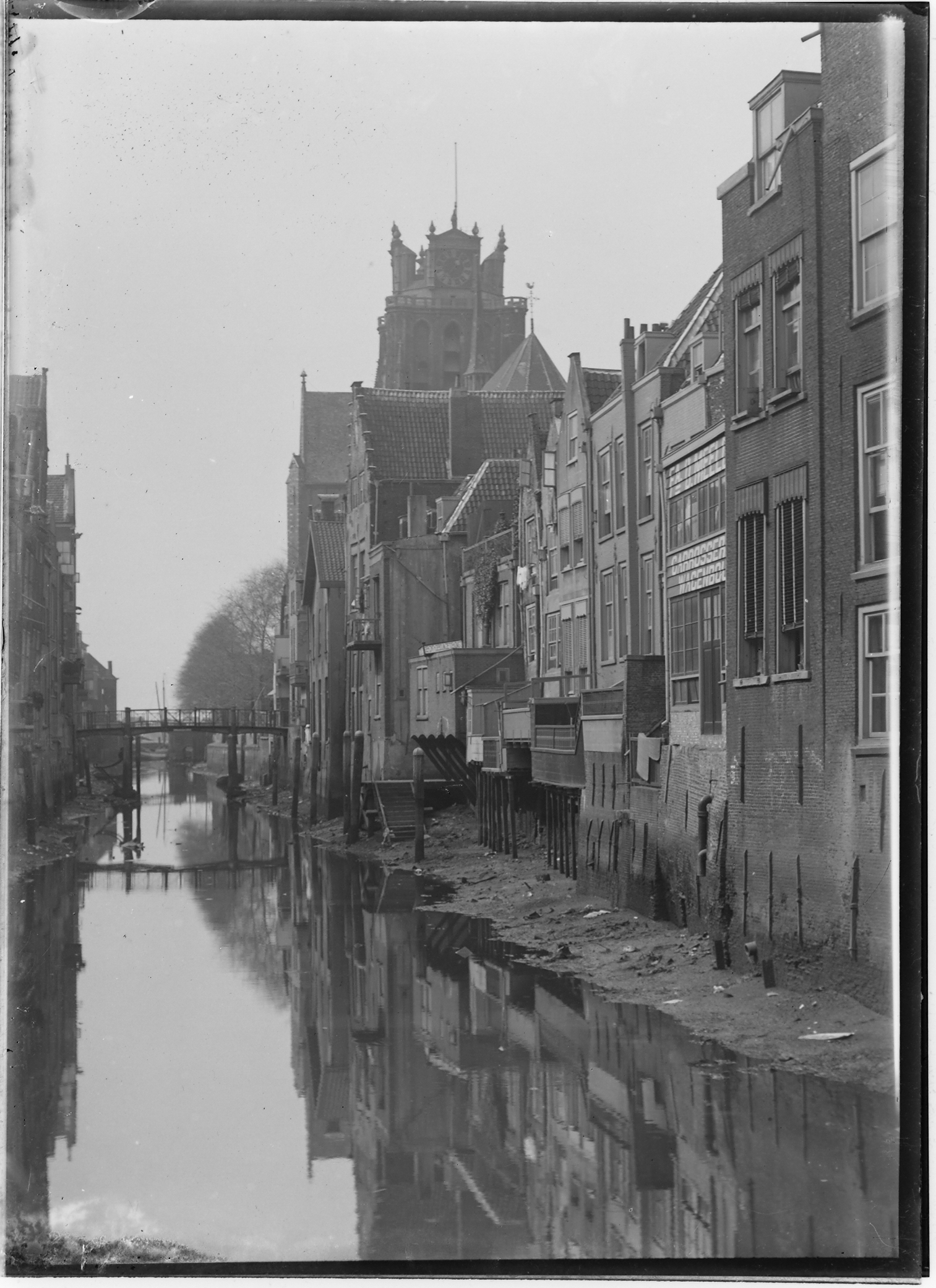 - Laag water in de Voorstraatshaven met de Pelserbrug en op de achtergrond de Grote Kerk. Panden aan de Grotekerksbuurt en links aan de Voorstraat