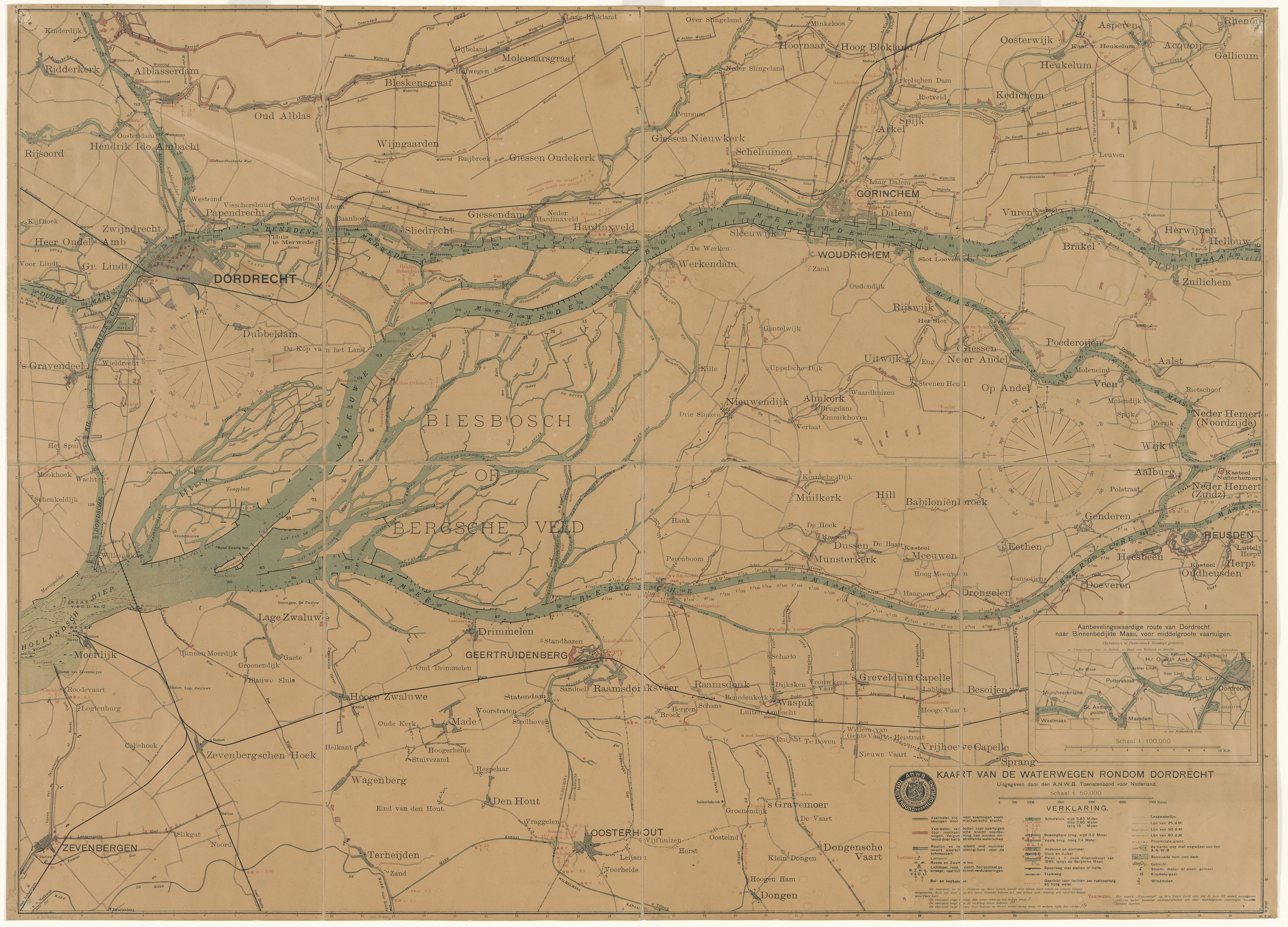 - Kaart van de waterwegen rondom Dordrecht. In het gebied tussen l.b. Kinderdijk, l.o. Zevenbergen, r.o. Heusden en r.b. Asperen.