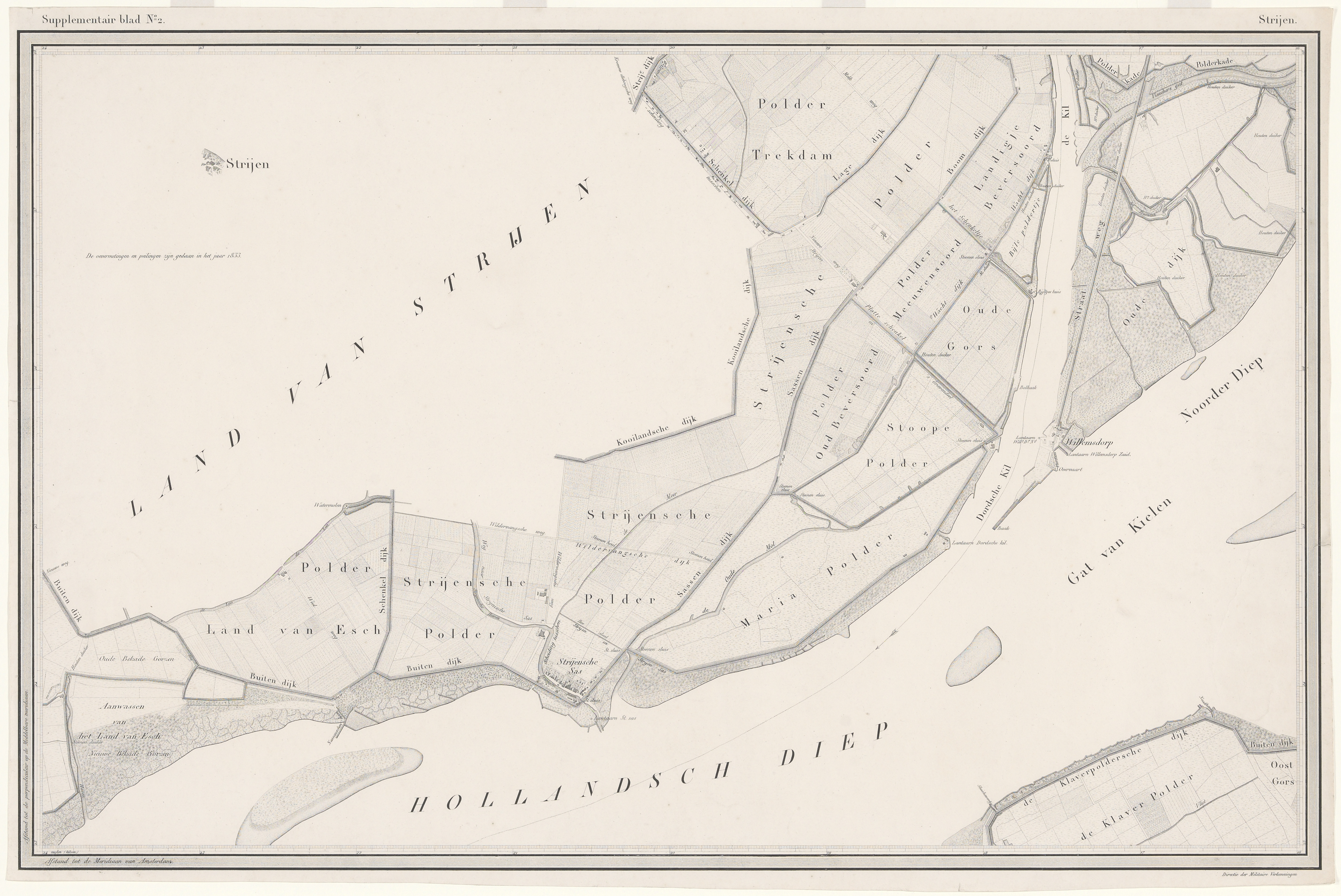 - Kaart van het zuidelijk deel van het Eiland van Dordrecht en het zuidoostelijk deel van de Hoeksche Waard, de Kil, Willemsdorp, het Hollandsch Diep en de Klaverpolder aan de overzijde van het Hollandsch Diep.