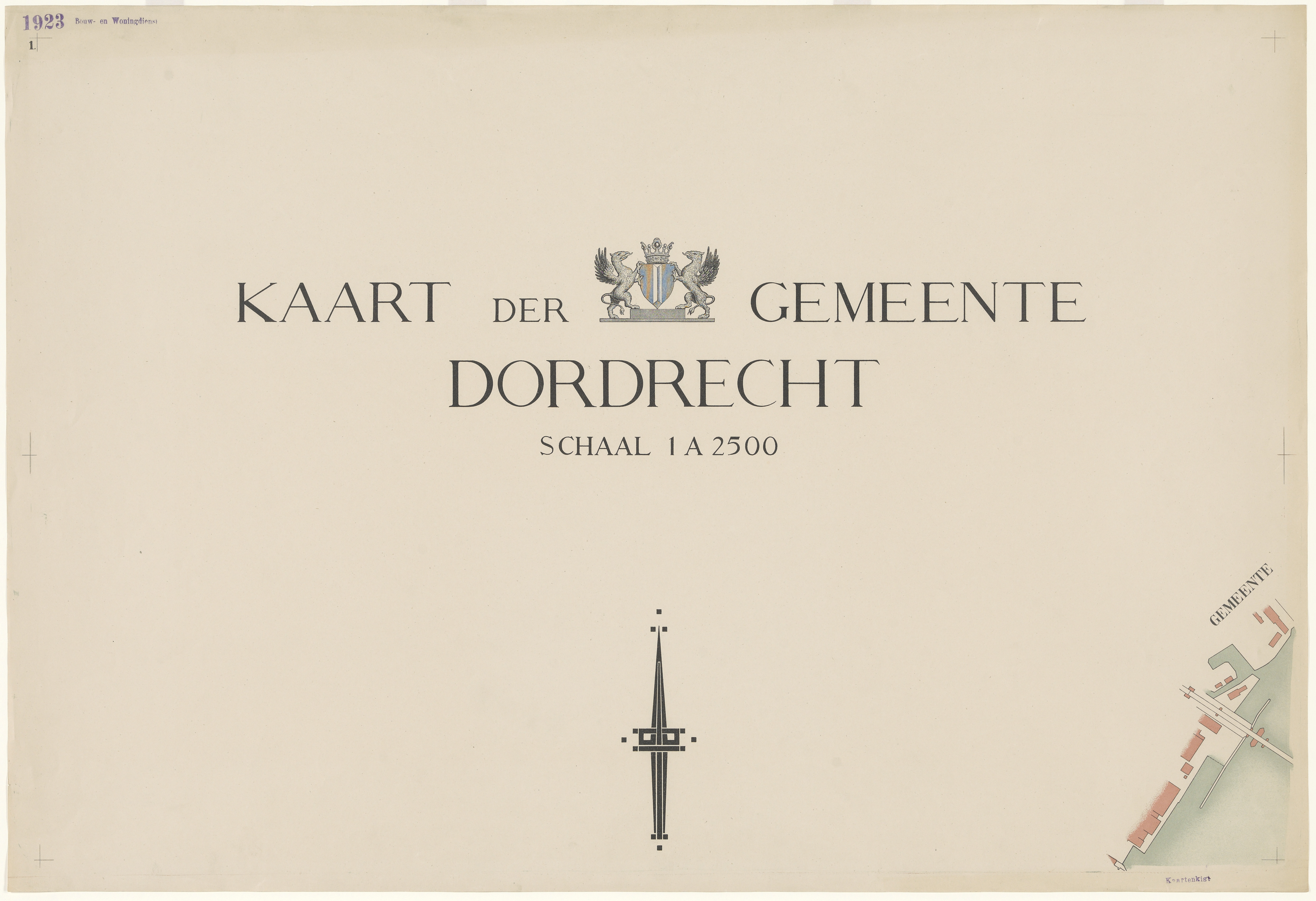Voorblad van de plattegronden van Dordrecht in 9 bladen, omvattende het gebied tussen de Krabbe, Oude Maas, Beneden Merwede, het Vissertje, de Zuidendijk en de Reeweg Zuid.