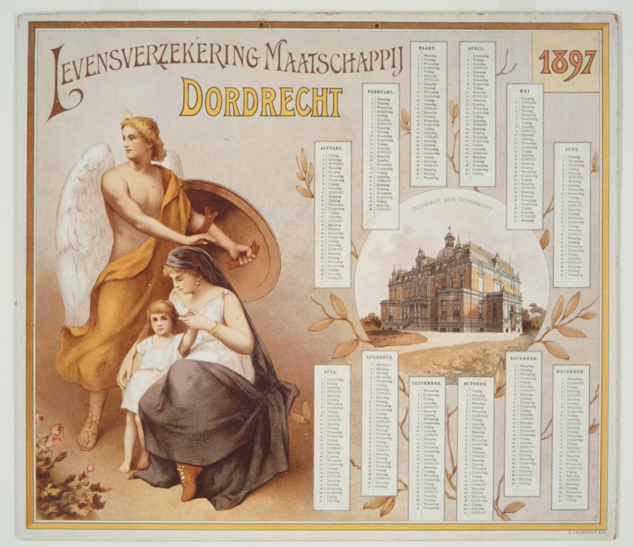- Kalender voor 1897 van de Levensverzekeringmaatschappij Dordrecht met een weduwe en kind door een engel met schild beschermd en Rozenhof, het kantoor van de maatschappij.