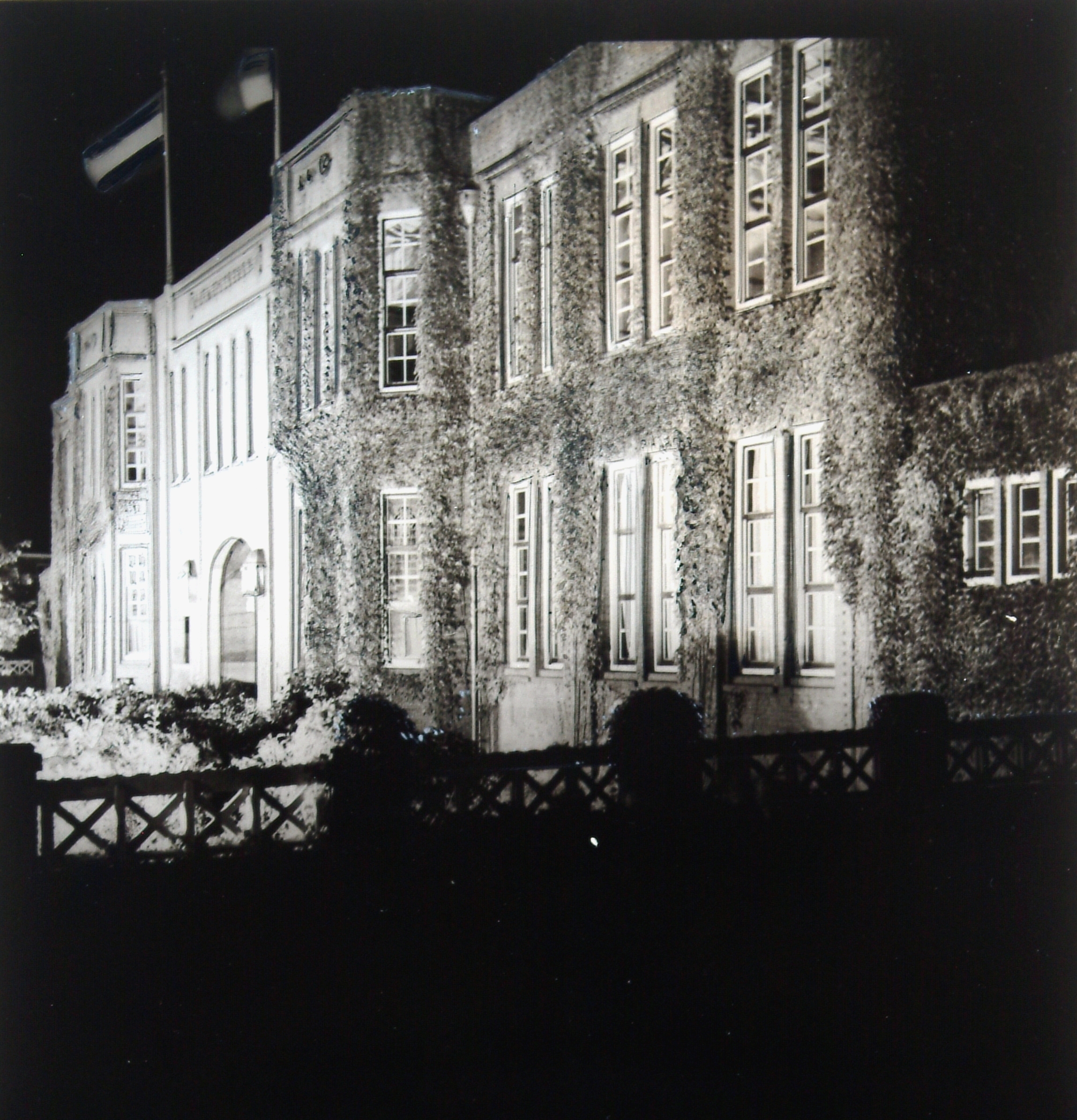 - De ambachtsschool - de latere L.T.S. - aan de Reeweg Oost. De verlichting van schijnwerpers is waarschijnlijk t.g.v. de verjaardag van de koningin.