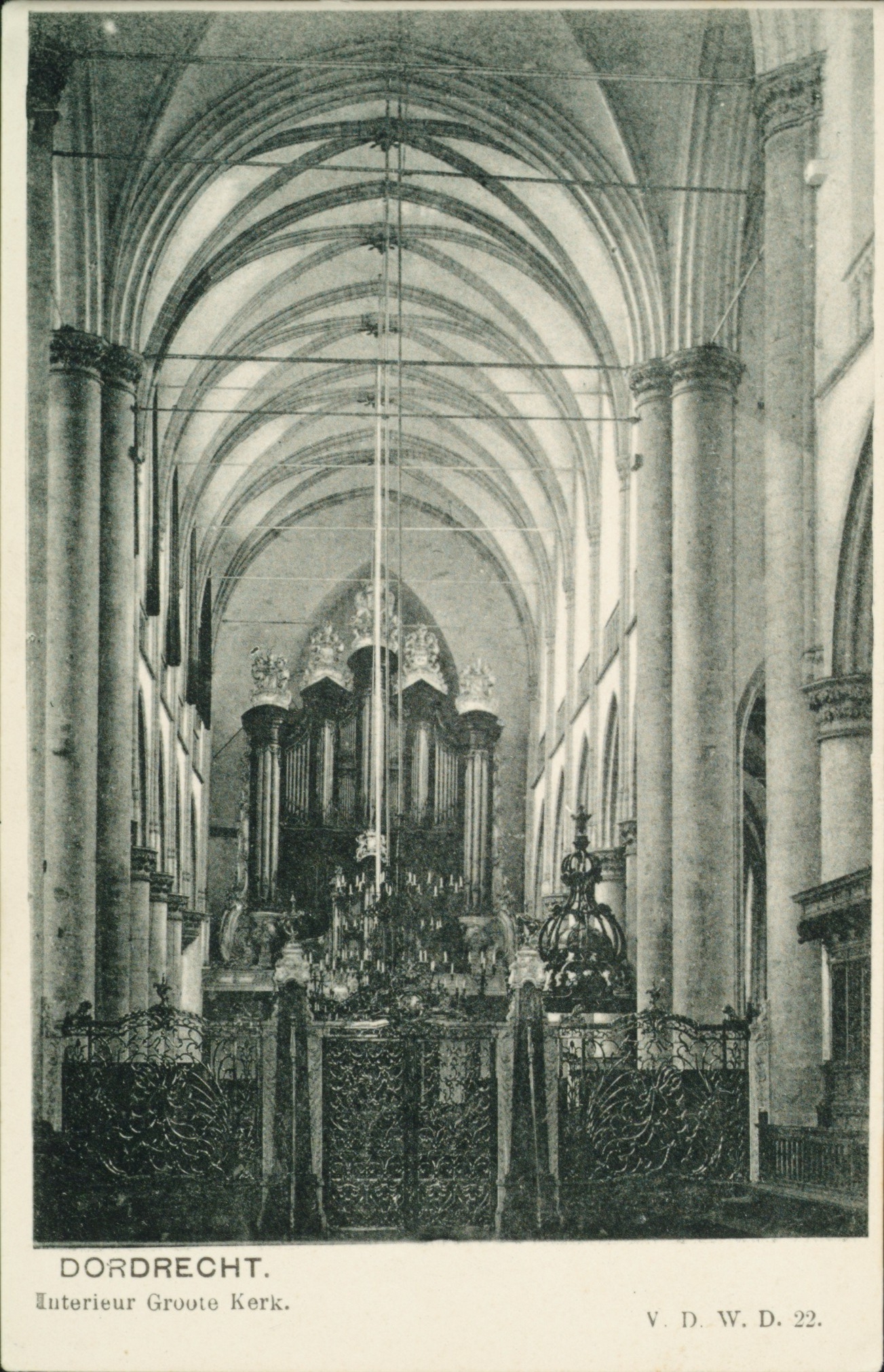 Lange Geldersekade. Het interieur van de Grote Kerk met het orgel, het Hoge Koor en het koorhek.