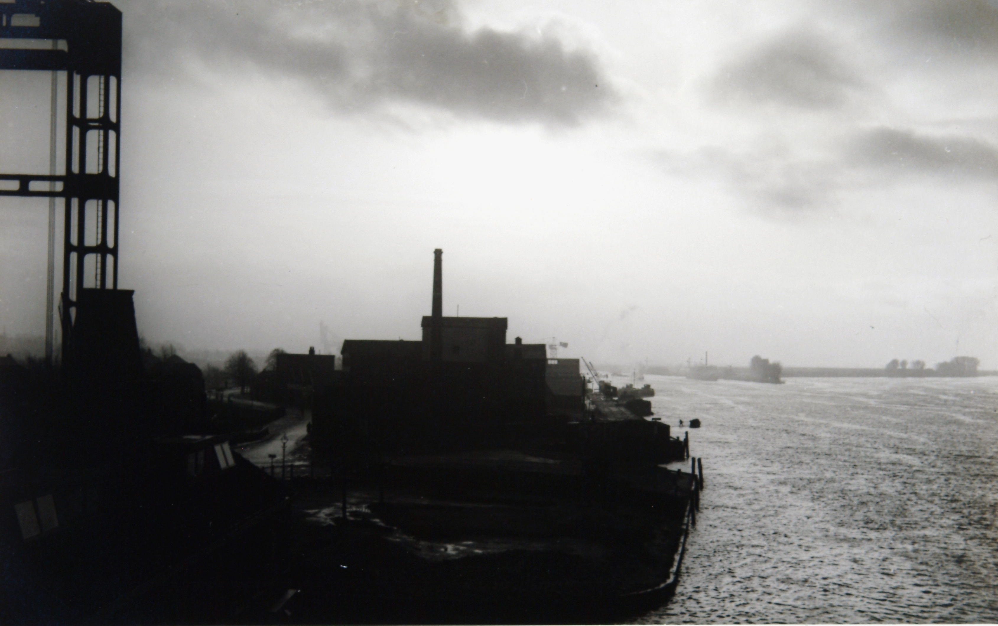 - Gezicht op de Oude Maas, met de Dordtsche Kil op de achtergrond. Links de heftoren van de Dokbrug. De schoorsteenpijp behoorde bij Farina aan de 's-Gravendeelsedijk.