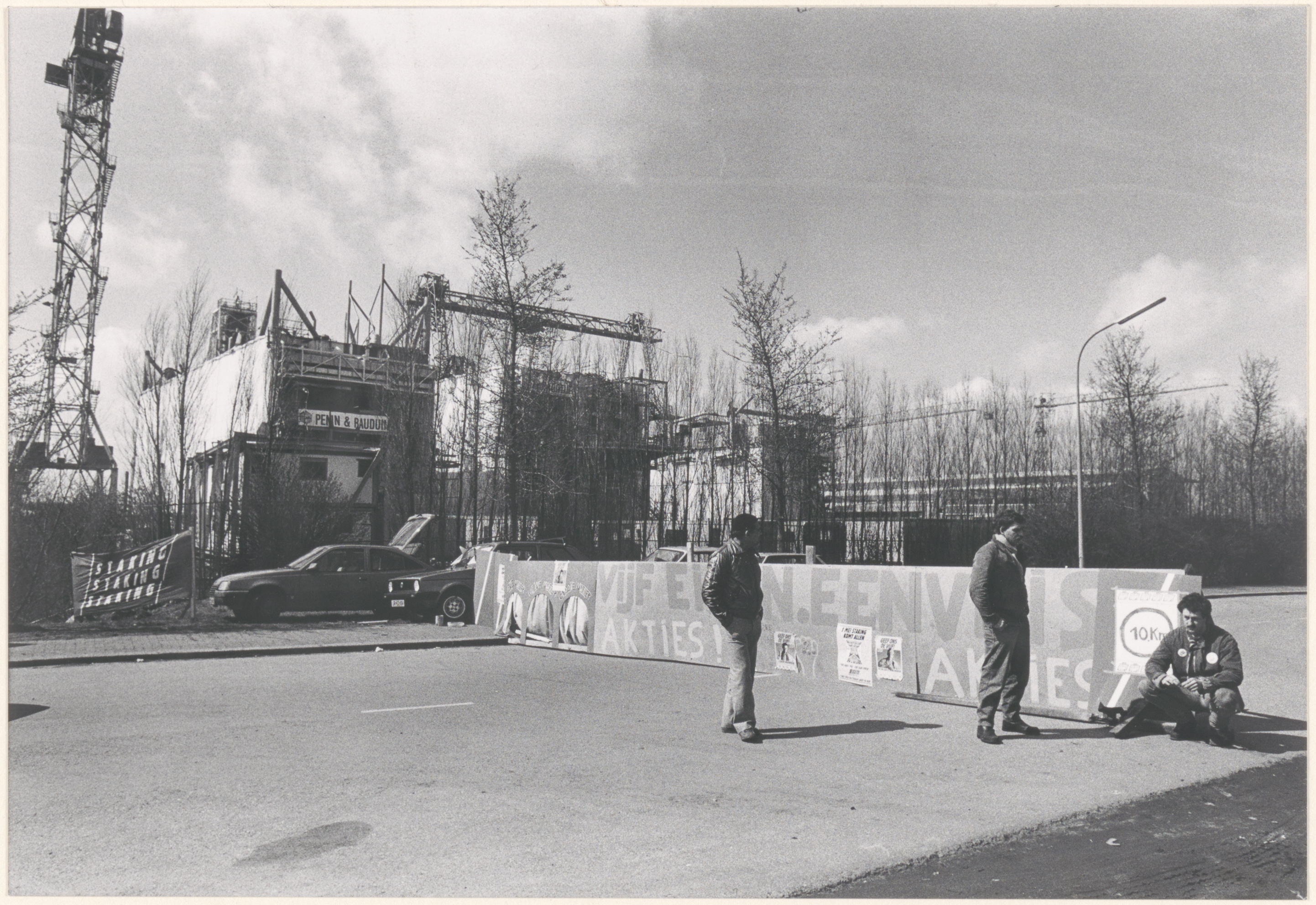- Door stakers van Penn en Bauduin is een bord met tekst 'vijf eisen een vuist' dwars over de Van Leeuwenhoekweg gezet, waarbij 3 stakers posten; op de achtergrond het bedrijf van Penn en Bauduin. De actie moest kracht bijzetten aan de eisen in de onderhandelingen over een nieuwe metaal-cao.