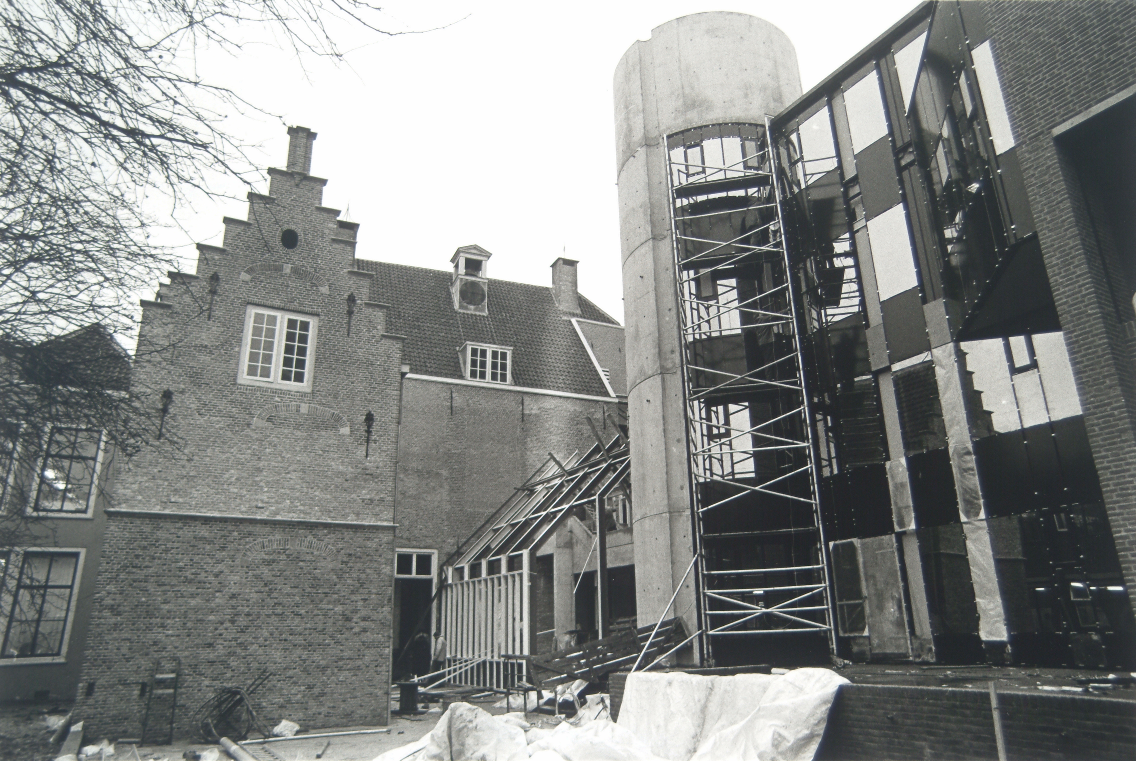 - Nieuwbouw met traptoren en verbindingsgang met de oudbouw in aanbouw achter de arrondissementsrechtbank aan het Steegoversloot