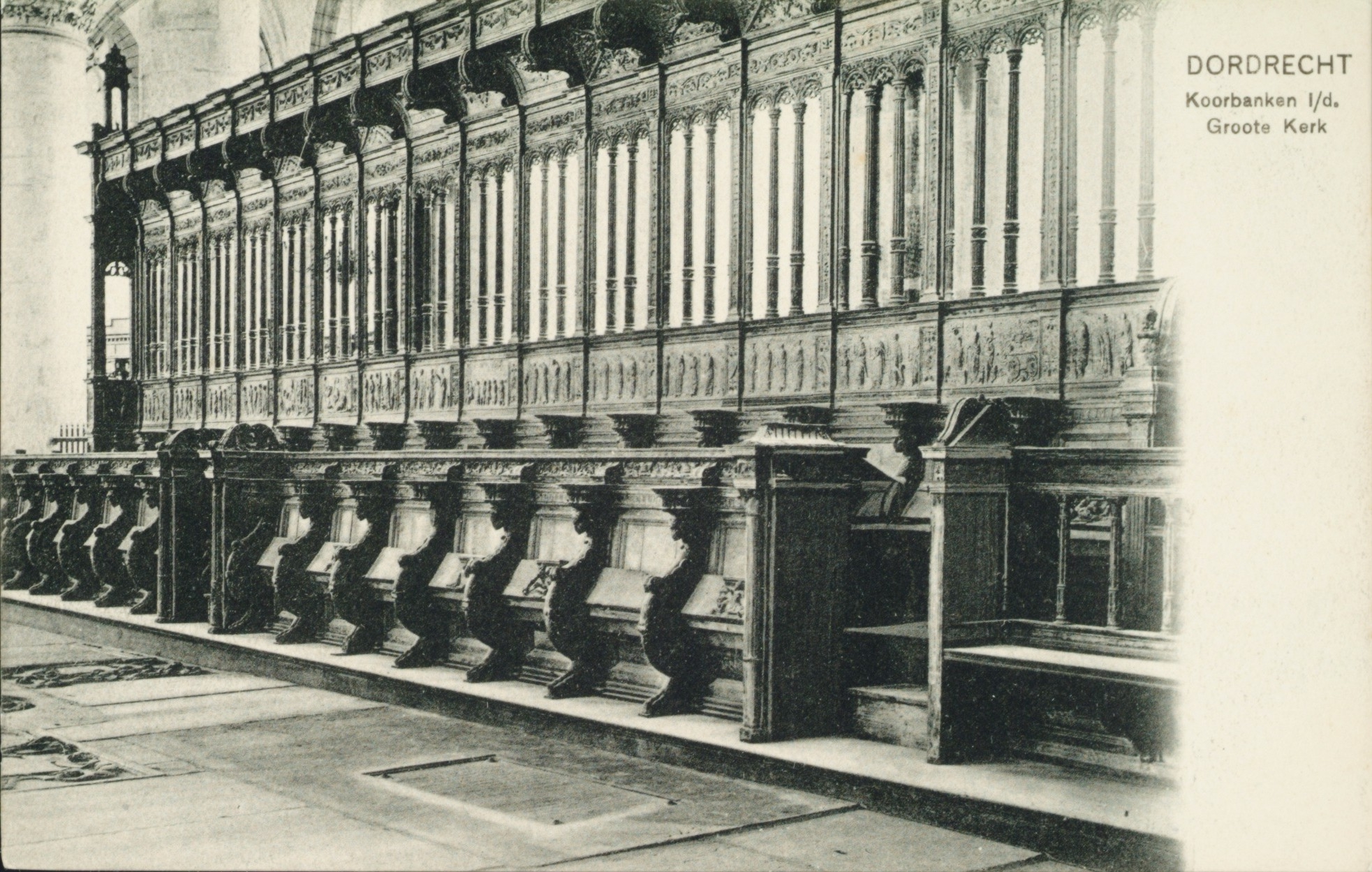 Lange Geldersekade, interieur van de Grote Kerk met de koorbanken Evangeliezijde.