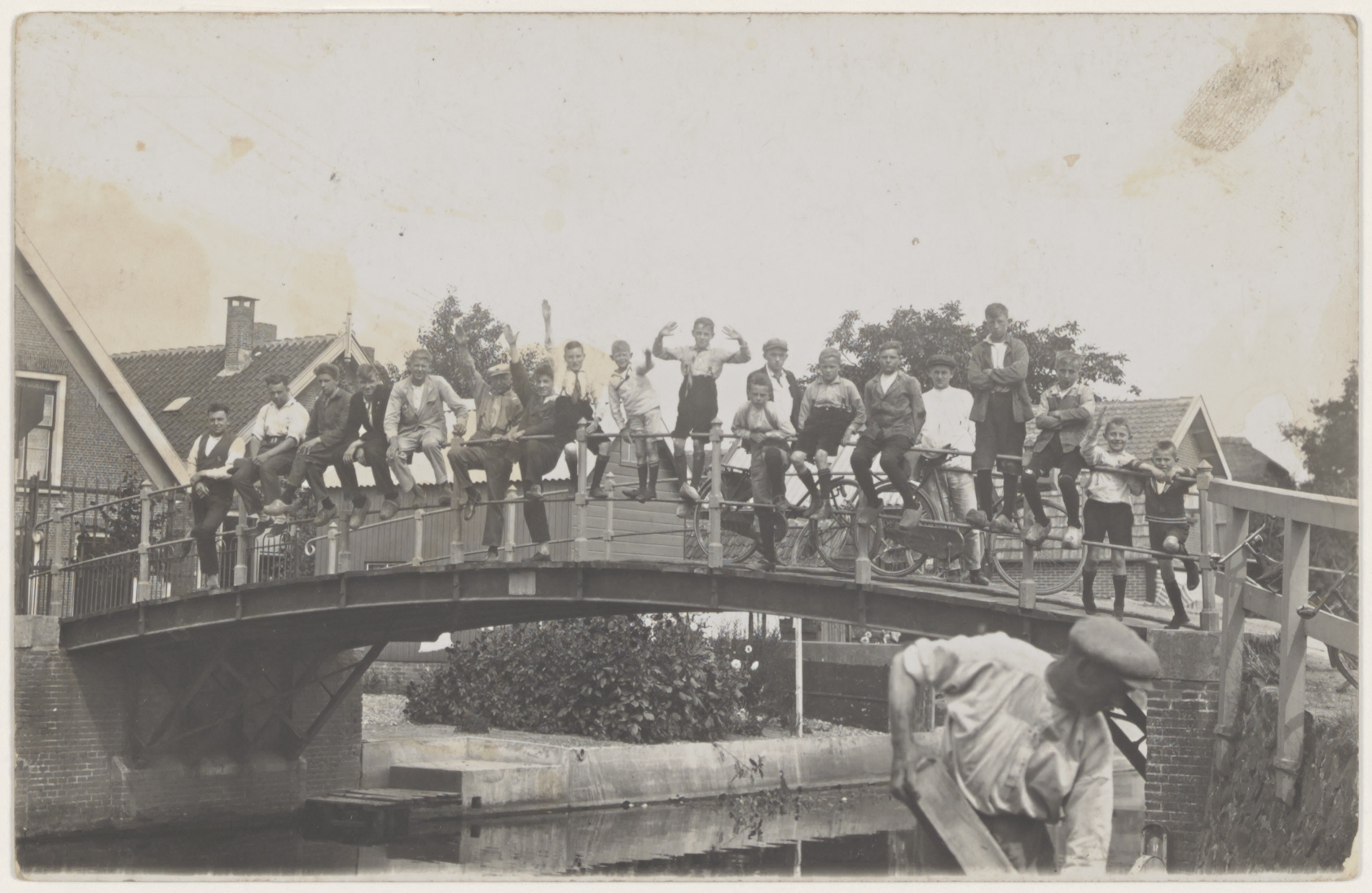 - Geheel links Van Wijk, naast hem zittend op de brugleuning Wim de Haan, Hamp Mouthaan, Eimert den Boer, Adriaan Vonk. Met de hand opgestoken Aart Mouthaan, Kees Mouthaan, Jo Hamerpagt, Vonk. Met twee handen omhoog Arie Eikelenboom, onbekend, Eikelenboom, onbekend dan twee jongens De Gier, Piet Noordergraaf, onbekend. De twee mensen op de fiets rechts Juur Ooms in zijn schilderskleren en links zijn knecht Dik Groenedijk.