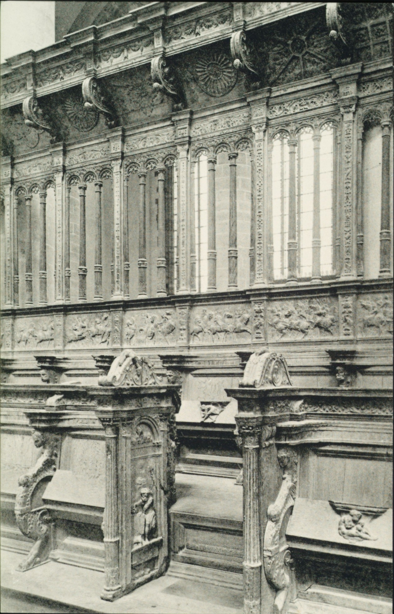 Lange Geldersekade, interieur van de Grote Kerk met een detail van de koorbanken