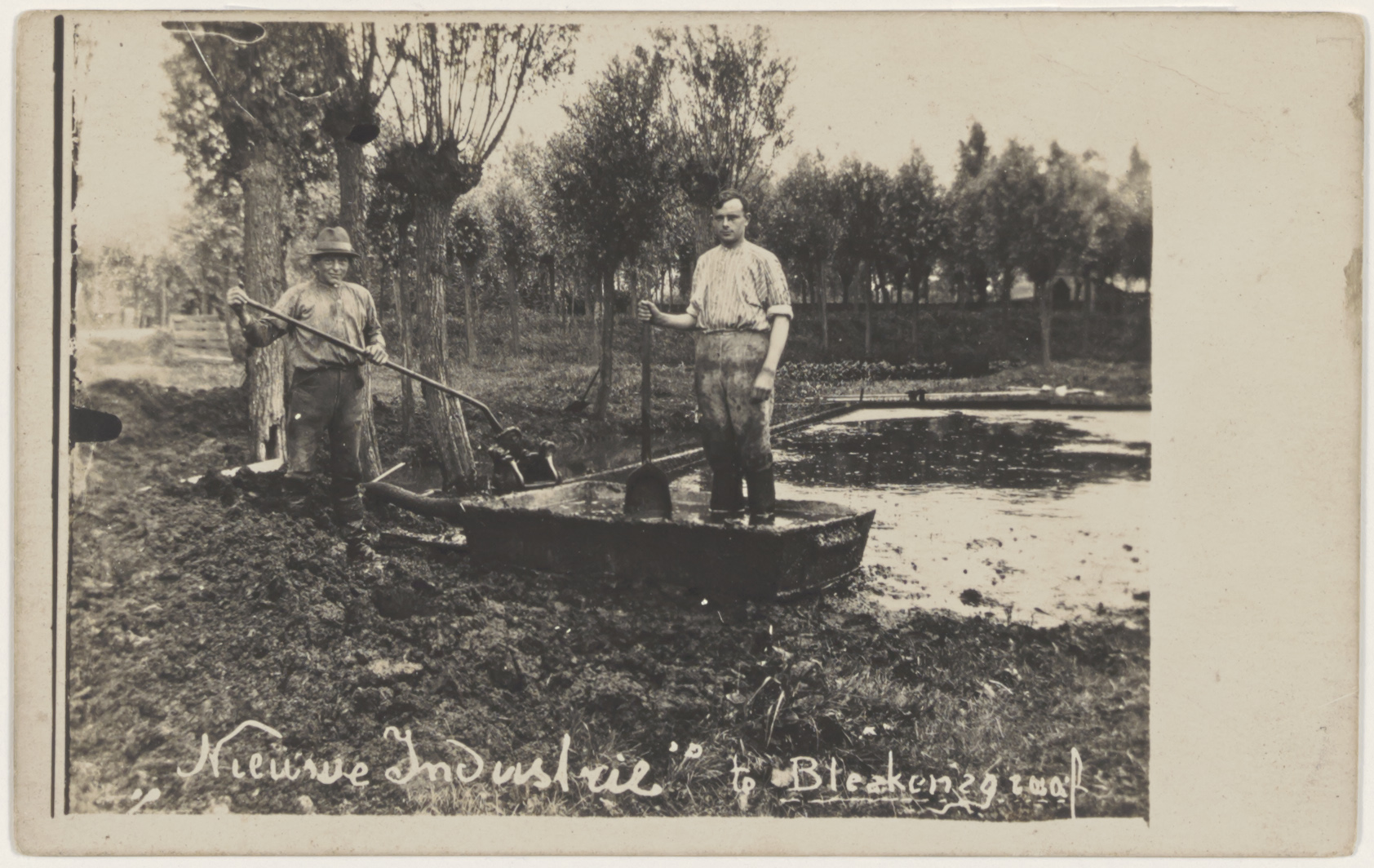 - "Nieuwe industrie" geschreven op de ansichtkaart. In de Eerste Wereldoorlog waren velen zaken schaars en duur. Zo ook de brandstof, vandaar deze "industrie", waarbij modder uit sloten werd gehaald en te drogen gelegd in een bassin om er later turven van steken. J.H. Ouderkerk en W. de Groot zijn hiermee bezig.