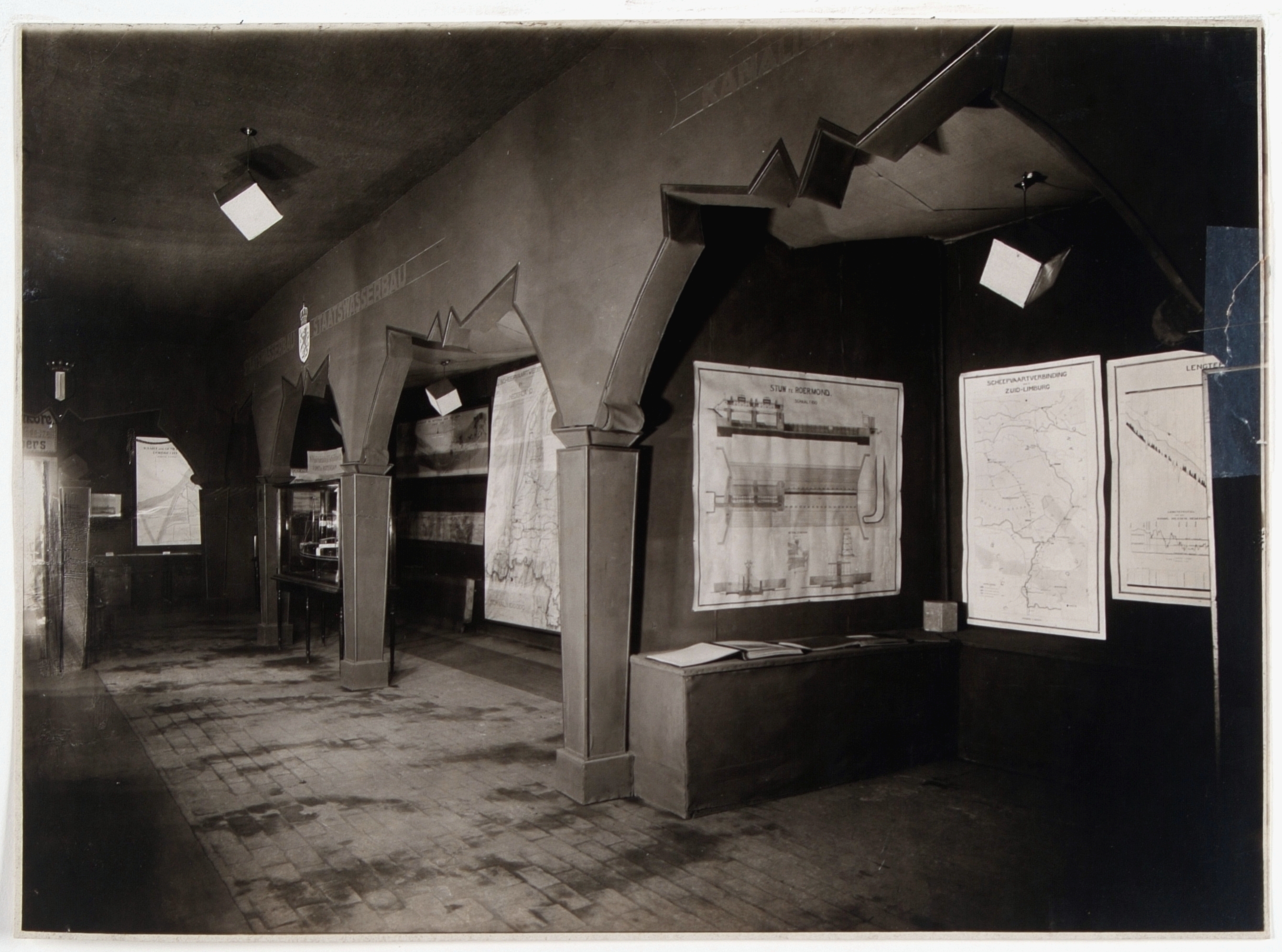 - Links de Dordtse stand over de Wilhelminahaven op een tentoonstelling in Essen