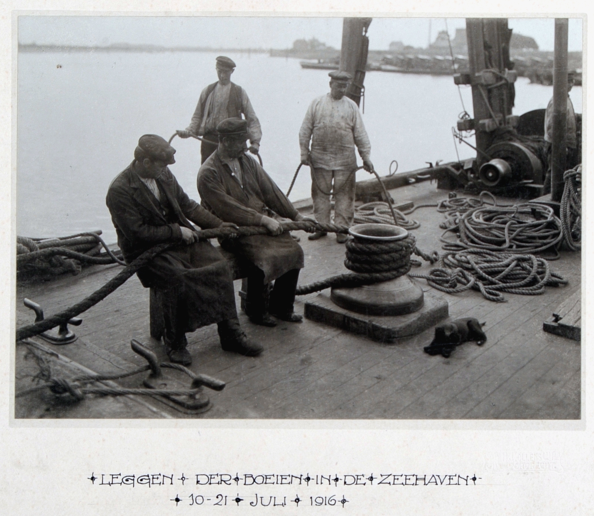 - Het leggen der boeien in de Wilhelminahaven met op de voorgrond een puppy